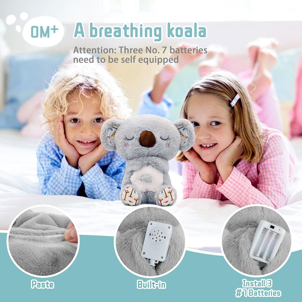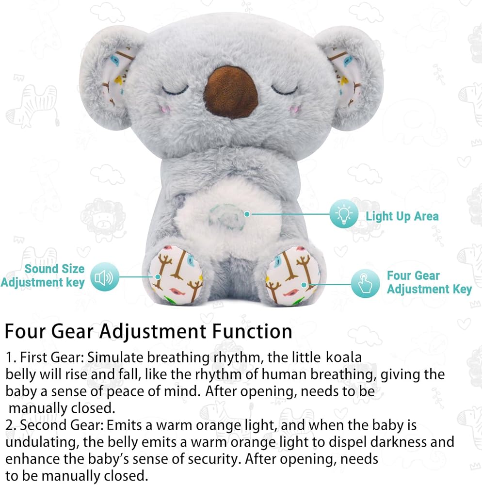 Sleep Partner Gentle Hug: Mush plushies companion will stimulate your baby's visual, auditory, and tactile senses through soothing music and rhythmic breathing movements. Easy to Use: Breathing plush right foot and are the four gear shift keys, and the right foot is the sound adjustment key. Open the Velcro on the back of your breathing plush, Instal 3 AAA batteries, Press the left foot music symbol to activate the sleep toy, It needs to be turned off manually by pressing the start button again.