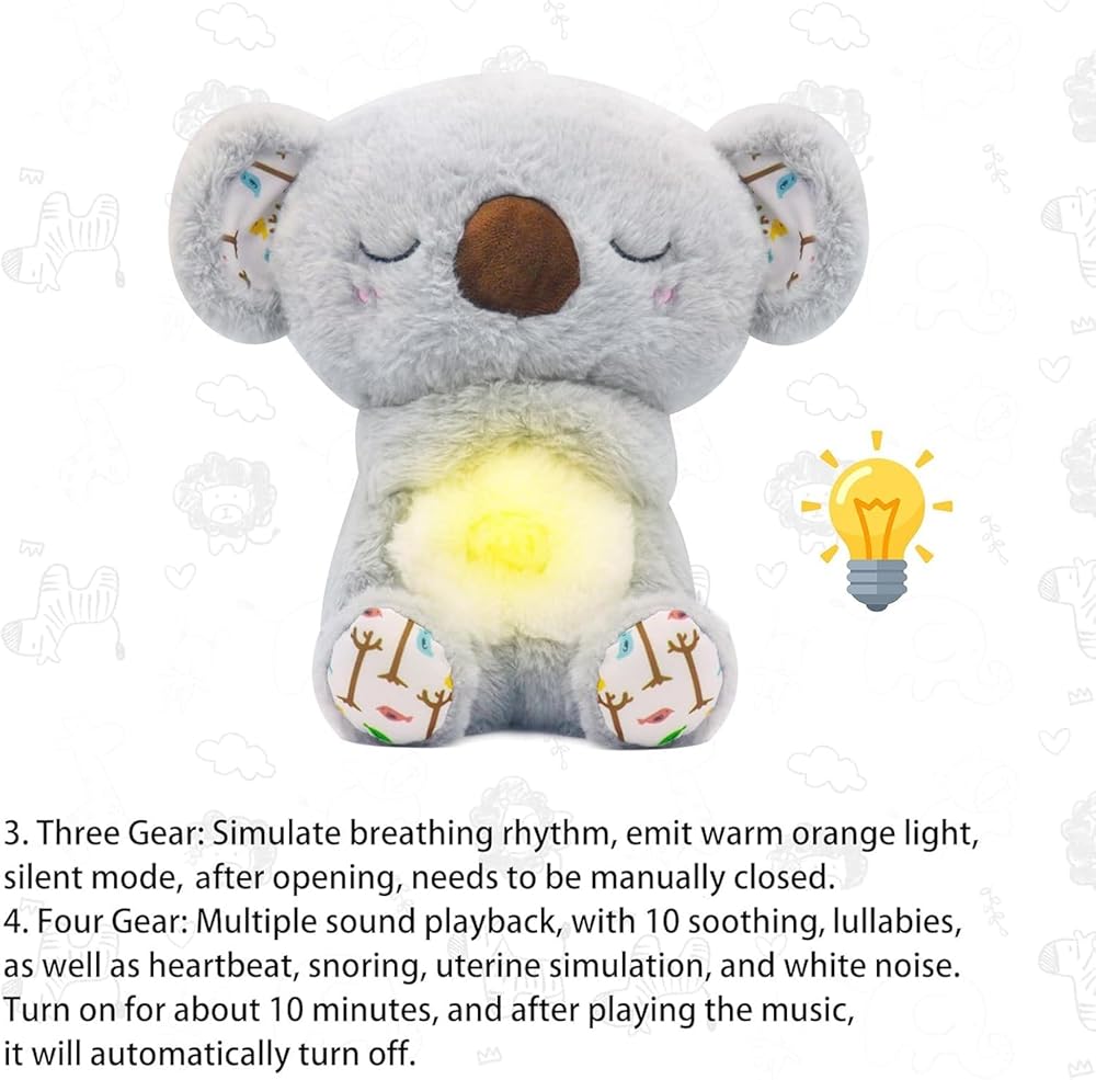 Three Gear: Simulate breathing change, emit warm orange light, silent mode, just like a person falling asleep, simulate the change of human breathing with the ups and downs of the belly, rising and falling one by one, needs to be manually closed. Four Gear: Multiple sound playback, with 10 soothing lullabies, as well as heartbeat, snoring, uterine simulation, and white noise.Turn on for about 10 minutes, and after playing the music, it will automatically turn off.