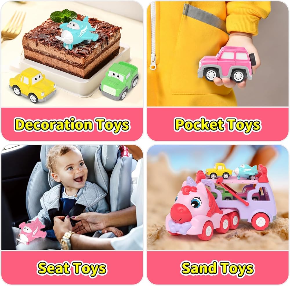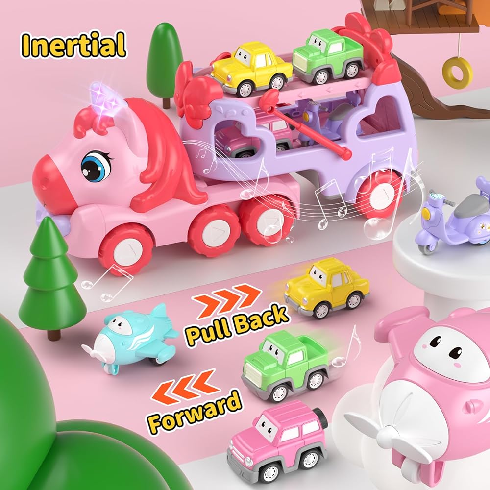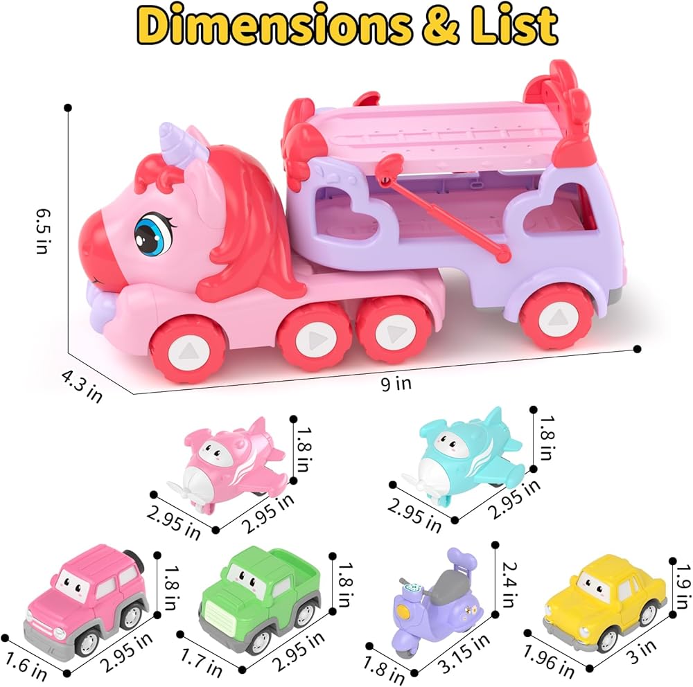 [7 IN 1 Girl Truck Toys] Toddler Girls toy trucks include 1 large unicorn car and 3 cars, 2 planes, and 1 motorcycle. The propeller of the mini flying car can be rotated, which increases the fun of playing, but also attracts children, so that each girl can learn to recognize some regular vehicle shapes.