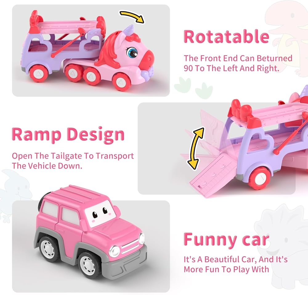 [Easy Operation Toys] As long as the toys for 2 3 4 5 6 year old girls just gently push the baby car, you can easily drive the cartoon car forward. In addition, the front of the Unicorn truck can turn 180° to easily turn around or avoid obstacles. The compartment can also be easily disassembled. Children can simulate road conditions to increase the fun of play. Please note that 2 AA batteries are required (not included in the package).