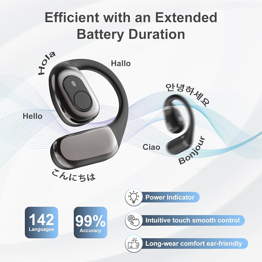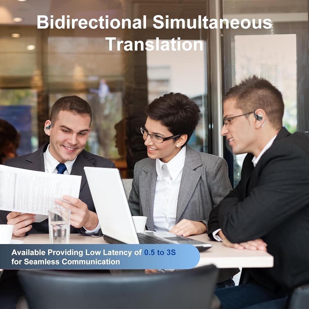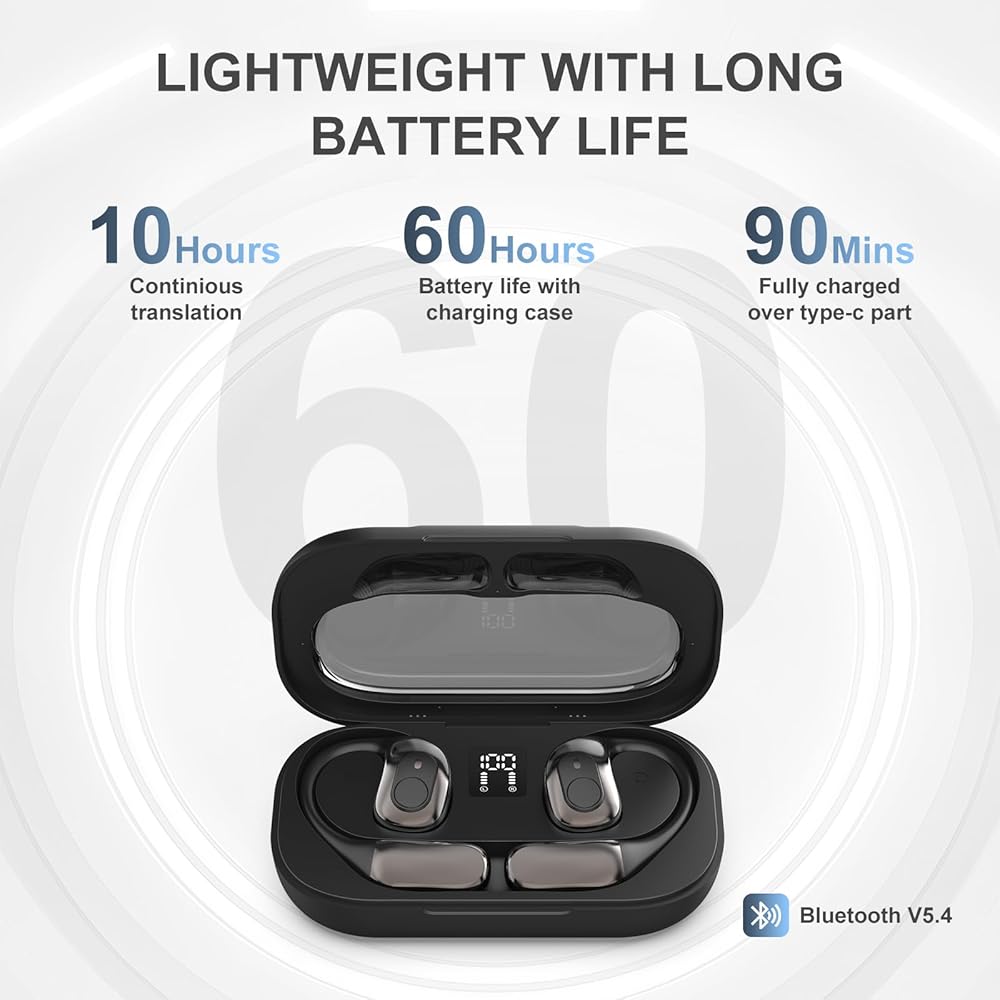 【High-quality products】 The translation headset is powered by a rechargeable lithium battery, with 6 hours of battery life and high-definition sound quality; Using Bluetooth 5.2 technology, the communication range is up to 50 feet
