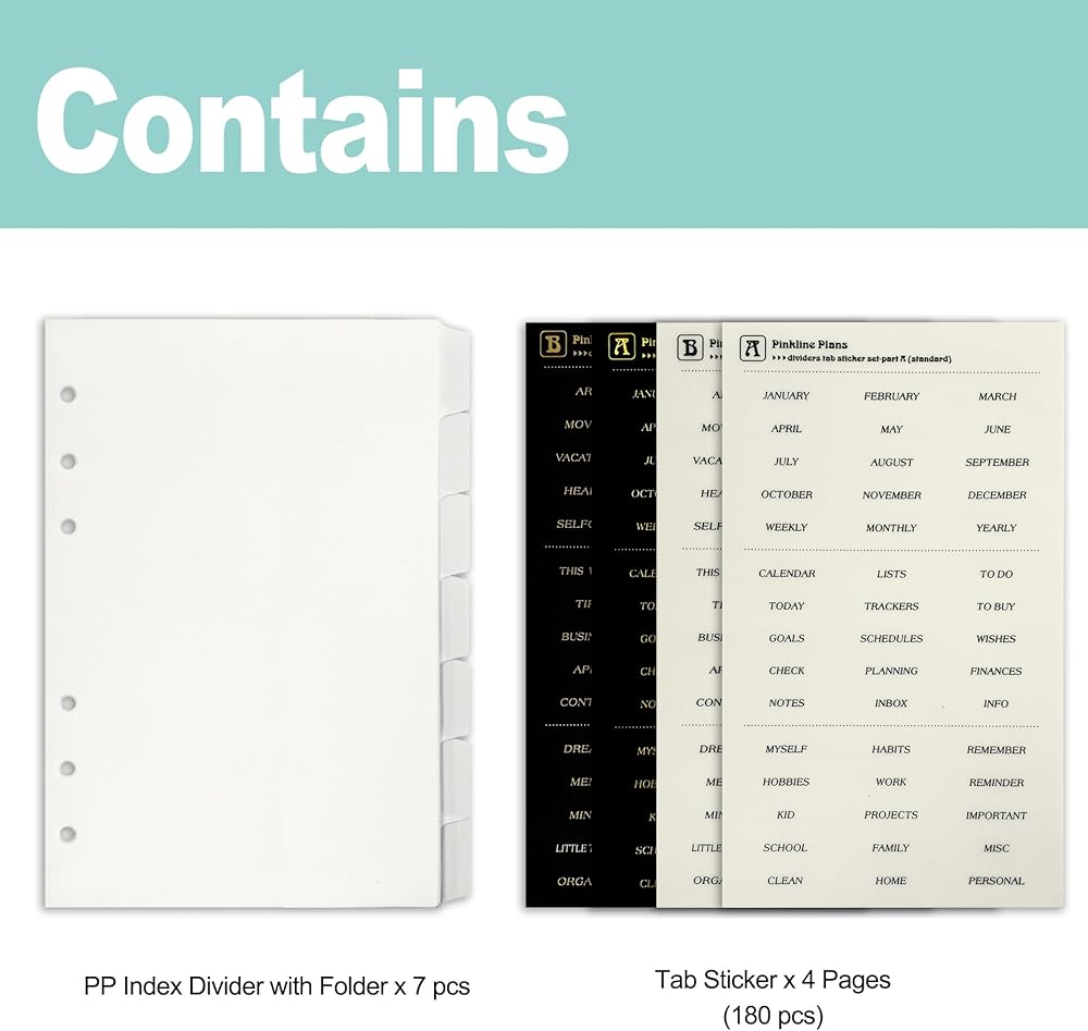 Value Kit includes: 7-Tab Black PP Binder Index Dividers with Folder & 4 Sheets 180pcs Tab Stickers