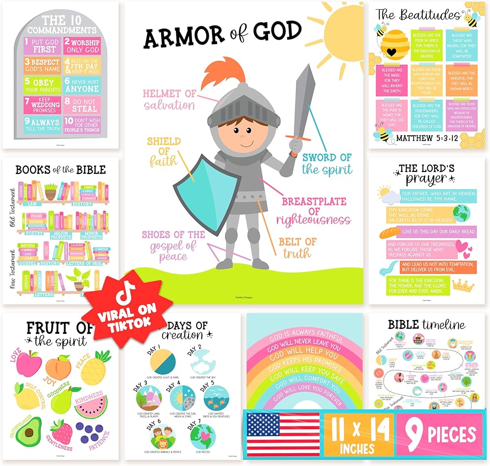 Inspire A Lifelong Love Of God's Word; You'll receive nine different 11x14 inch Bible posters, so you can easily ignite a passion for God's teachings, Use as religious posters for church or Sunday school posters for kids classroom
