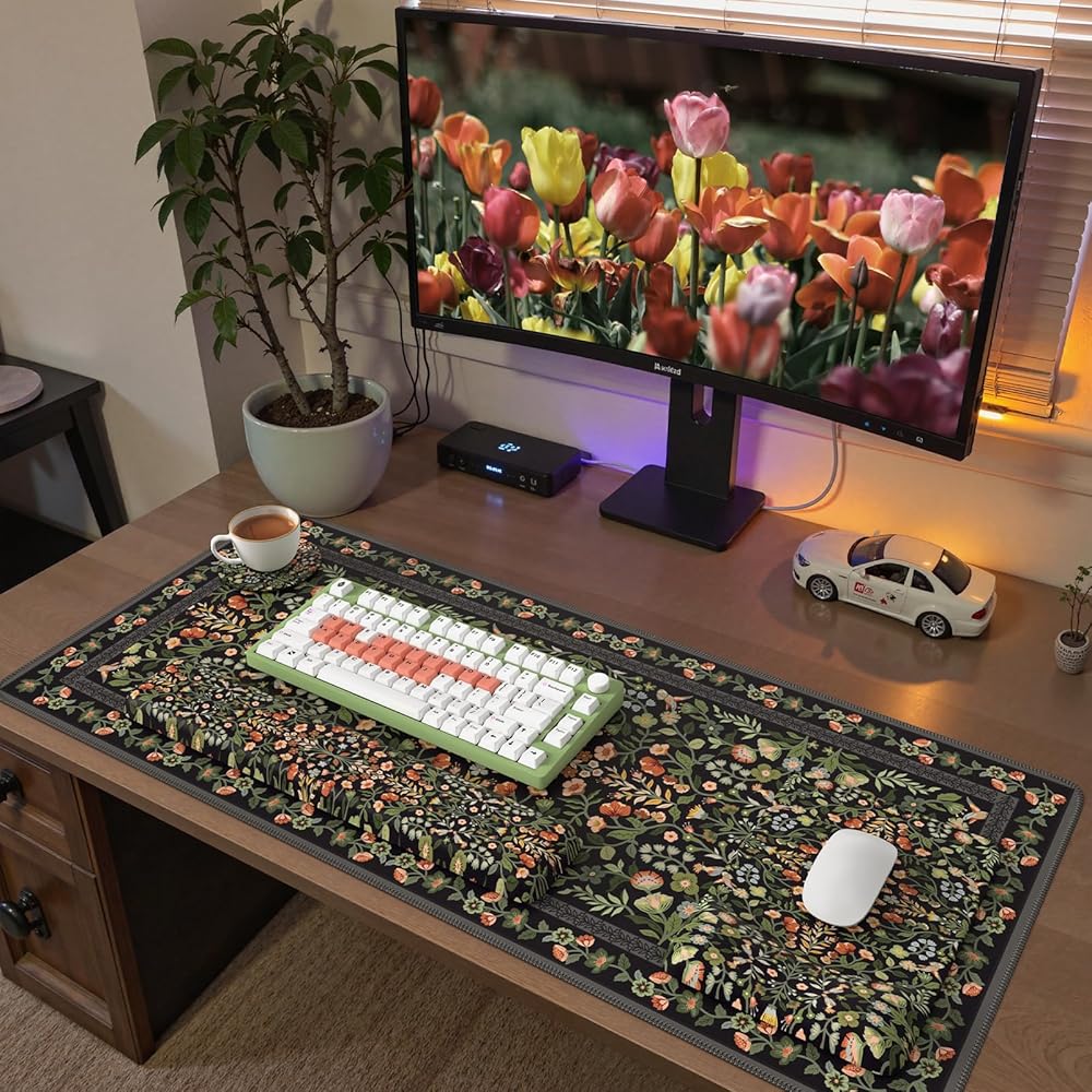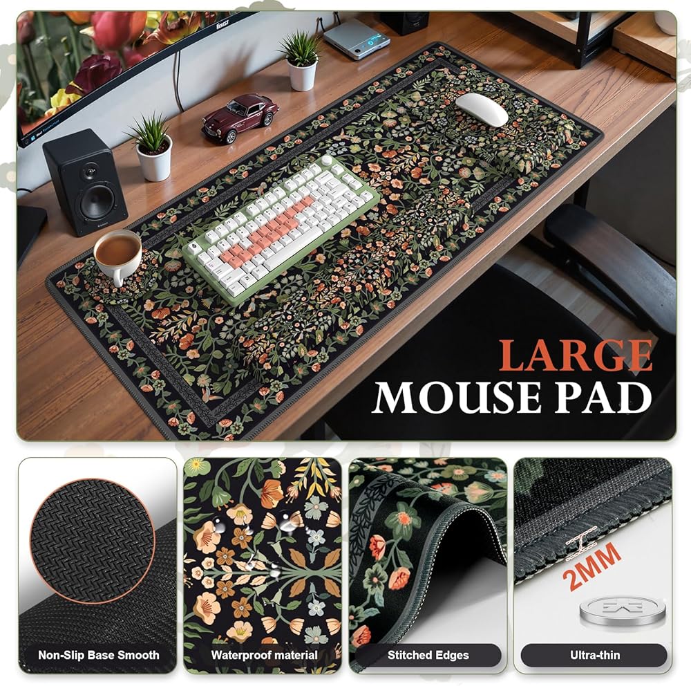 iCasso Desk Mat with Wrist Rest,Large Desk Pad for Keyboard and Mouse,Ergonomic Mouse Pad Sets for Women,Non-Slip Wrist Pad for Keyboard,Floral Computer Mat for Home Office (Black)