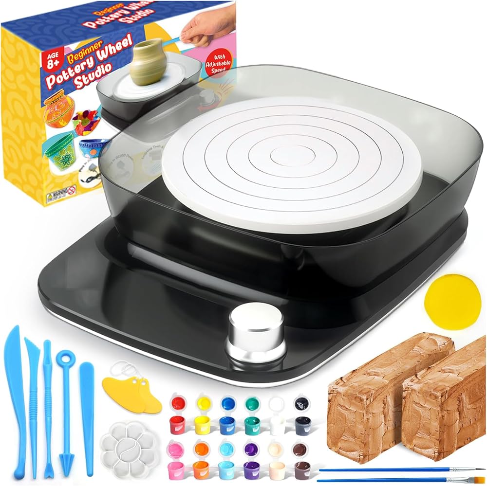 ✨ ALL INCLUSIVE POTTERY KIT: The complete pottery kit comes with everything kids need to get started easily, including a Pottery wheel, Clays, Cut off tool set, Sculpting tools, Wooden sticks, Paint colors, and Sponge. This kit delivers all the essentials required to mold, fashion and color your clay into breathtaking works of art, Easy to use for your children.