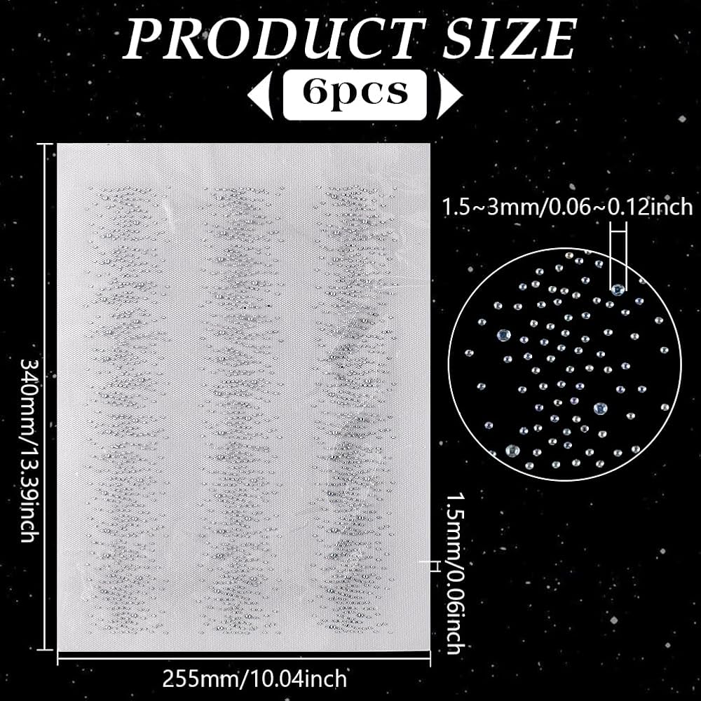 Package and Size: You will get 6 sheet full rhinestone iron on transfers(3 pcs/sheet, total 18 pcs). Size: about 1 sheet: 255mm/10.39 inch wide, 340mm/13.38 inch long, Rhinestone: 1.5~3mm in diameter.