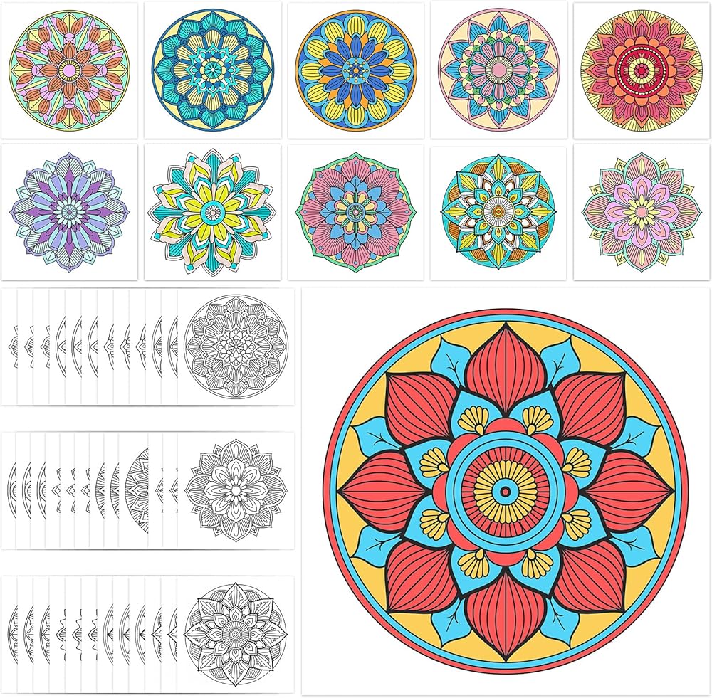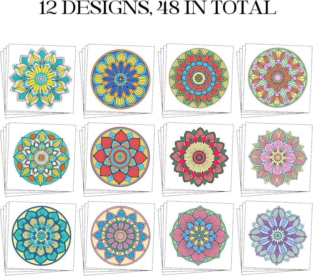 Multi-Themed Coloring Set: This adult colouring card set includes 48 single-sided Mandala drawings with patterns from 12 different themes. Each page features unique designs for a varied colouring experience.