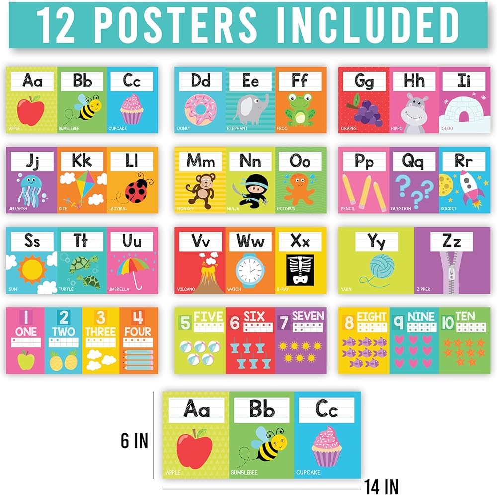 Inspire A Love For Learning; You'll receive 12 different 6x14" posters; so you can easily teach children their ABC's, Use as abc letters for classroom wall, classroom alphabet for wall alphabet wall art or preschool classroom decorations