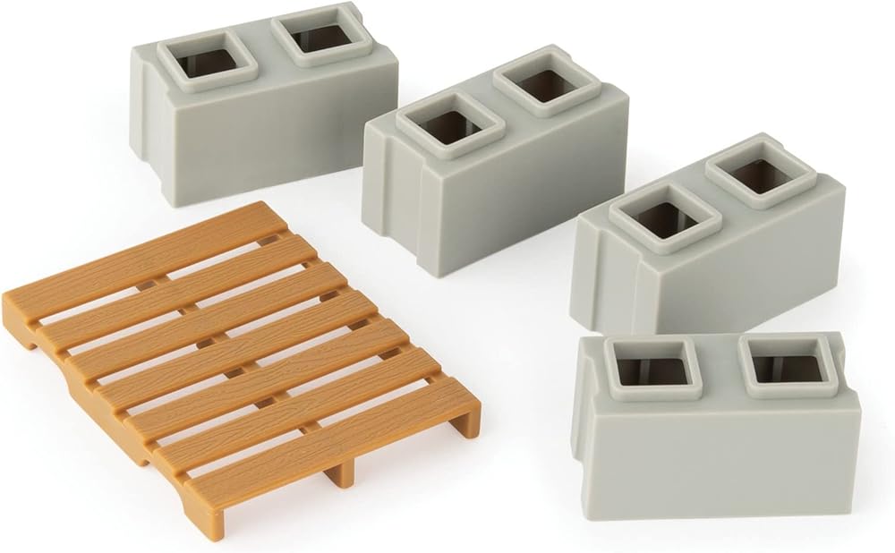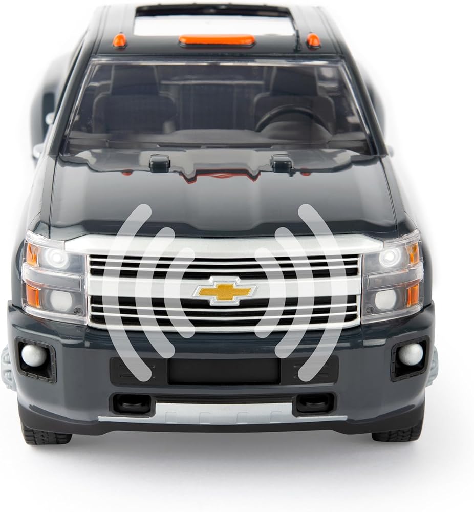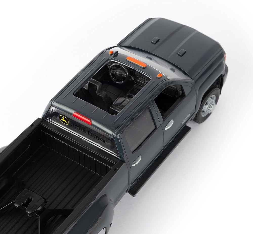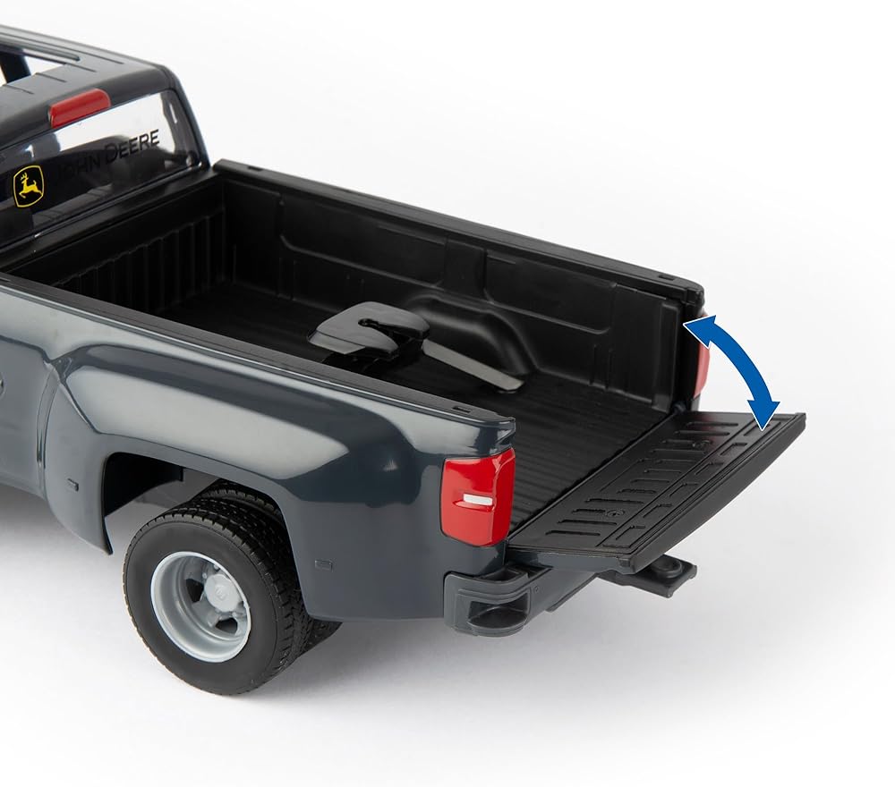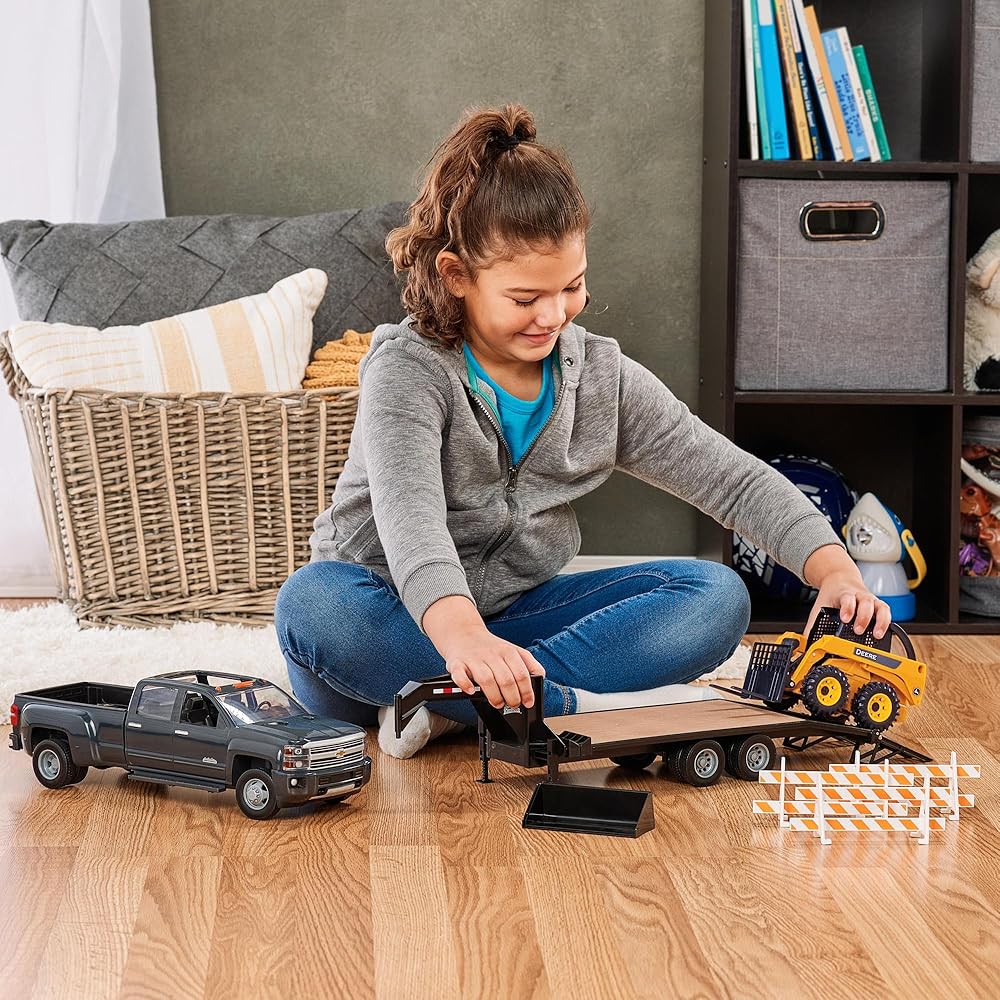 A wonderful constuction play item featuring a 1:16 Chevrolet Silverado and John Deere Skid Steer with a 5th wheel trailer.. This set is enhanced for construction play by including 4-Cement Blocks and barricades. Vehicles required 3 -AAA batteries for a total of 6 (these are included). Age 3+