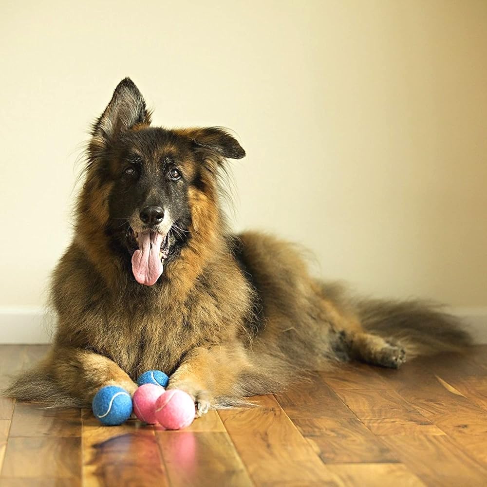 - Includes blue 2.5" in diameter dog tennis balls. These balls do NOT contain squeakers.