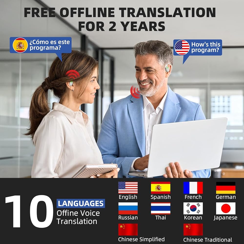 Free Offline Translation for 2 Years: The ai translation earbuds can still translate smoothly without WIFI. Support 10 languages: Simplified Chinese, Traditional Chinese, English (U.S.), Japanese, French, Korean, German, Russian, Thai, Spanish (Note: offline can only be used on up to 2 phones, after 2 years you still need to purchase the translation offline package through the app)