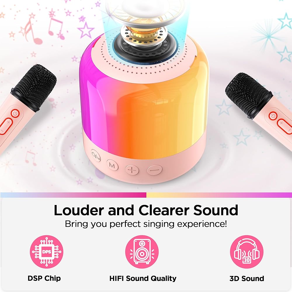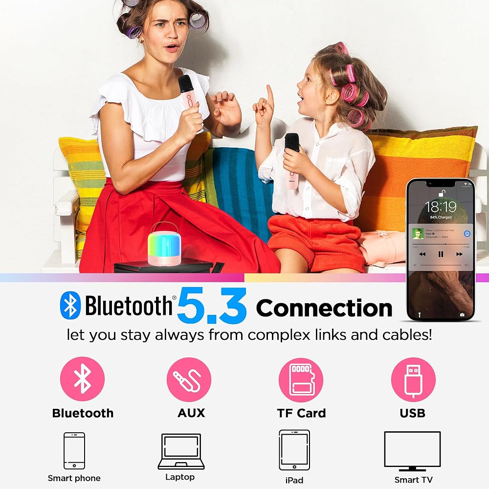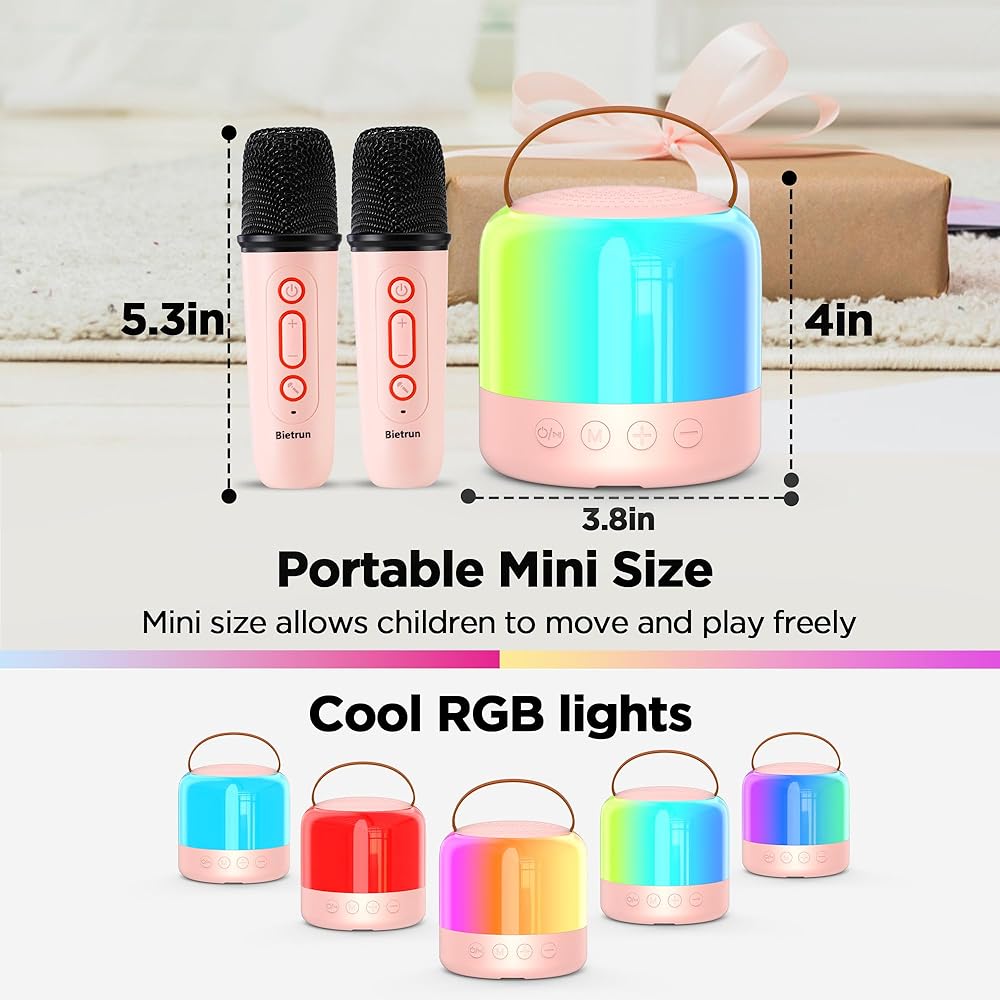 Mini Karaoke Machine with 2 Wireless Microphones for 5 Years Old Kids, Rechargeable Portable Bluetooth Karaoke Singing Speaker with Voice Changing, RGB Light, for Birthday, Family, Home Party Gift