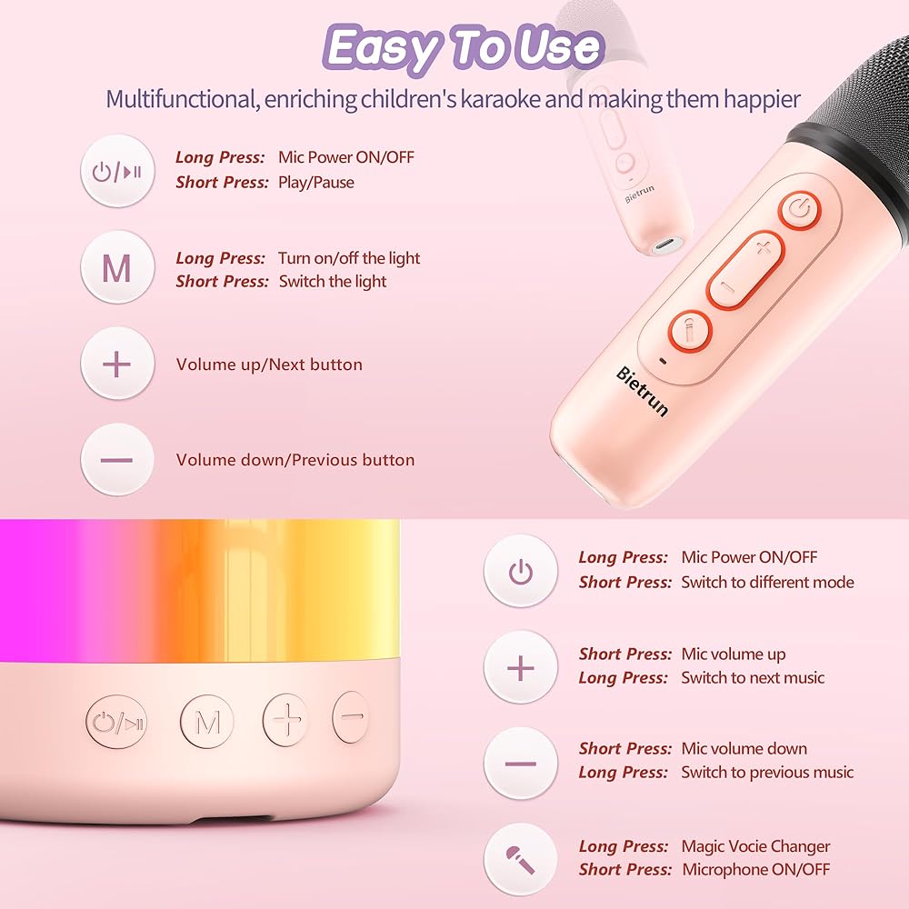 ✨【Vibrant Ambient LED Light】Our mini karaoke machine features dazzling and colorful lights. (Long press to turn on/off the light. Double press to switch the light) 🎁Ideal for both lively daytime activities and peaceful evenings, this karaoke machine provides a fun and safe experience for kids.