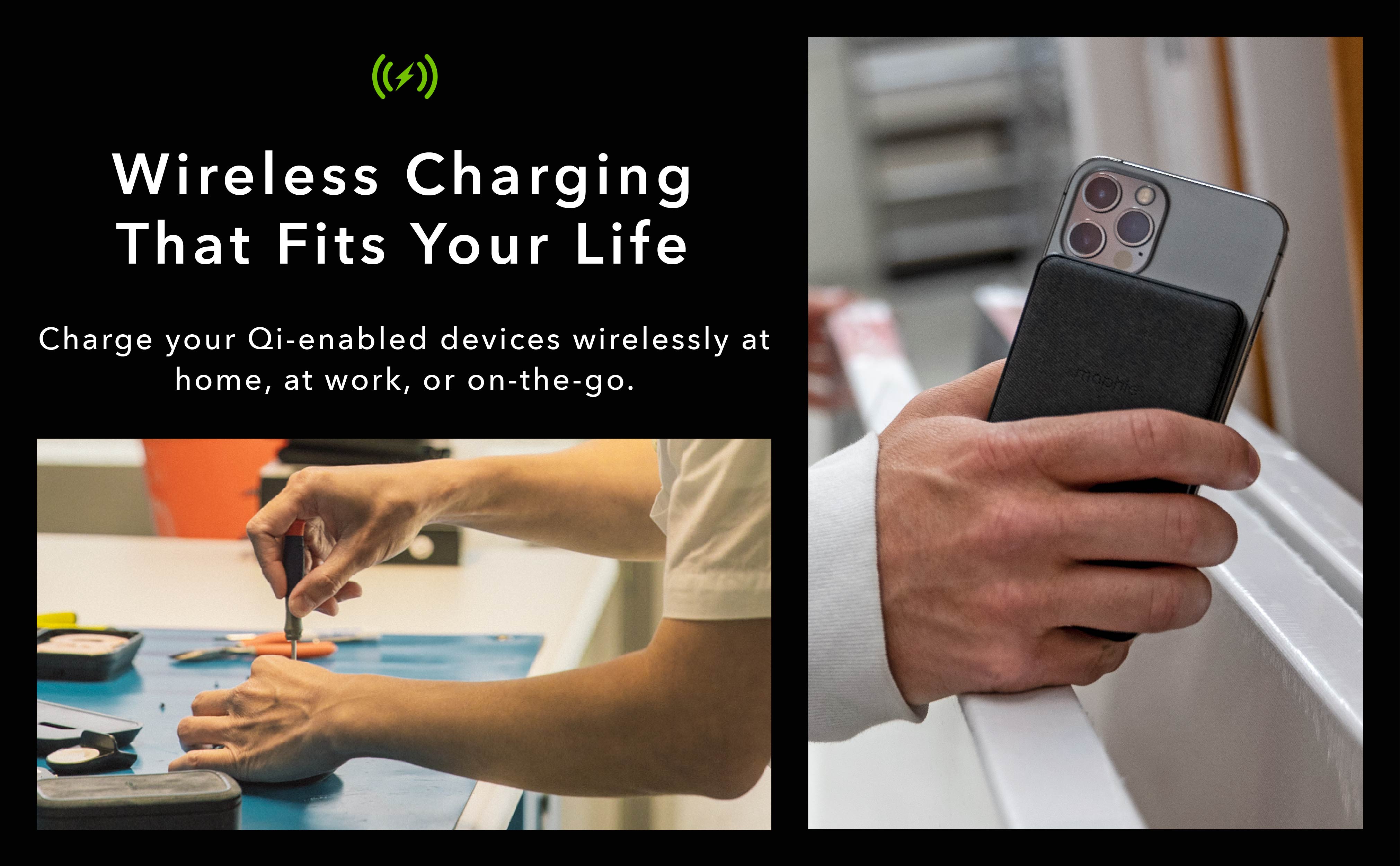 The mophie Juice Pack Wireless Charging Protective Power Pack Case helps you get through your day with on-demand power and enhanced protection. Simply tap the juice pack case to any Charge Force accessory, and the magnetic mounts will line with the case for a consistent charge every time, and the charging begins as soon as it comes into contact with the charger. This innovative Power Pack case features an ultra breakthrough charge force technology that allows the Smart charging circuitry to give only the optimum amount of power for fast and safe charging. You can select when to charge or preserve some power for when you need it most with the integrated standby button. The power case supports Qi as well as other wireless charging technologies often found in airports, coffee houses, cars, and other locations that enable wireless charging. When connected to a computer, the accompanying micro USB cable enables pass-through charge and sync, allowing your iPhone to be charged first, followed by the battery case.