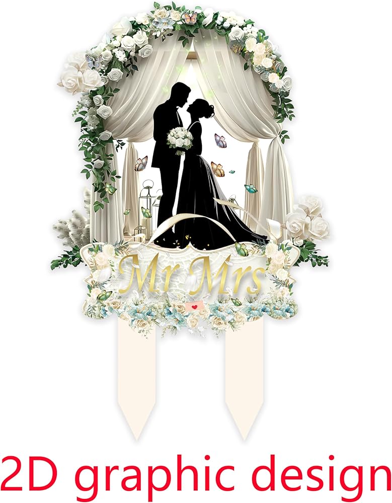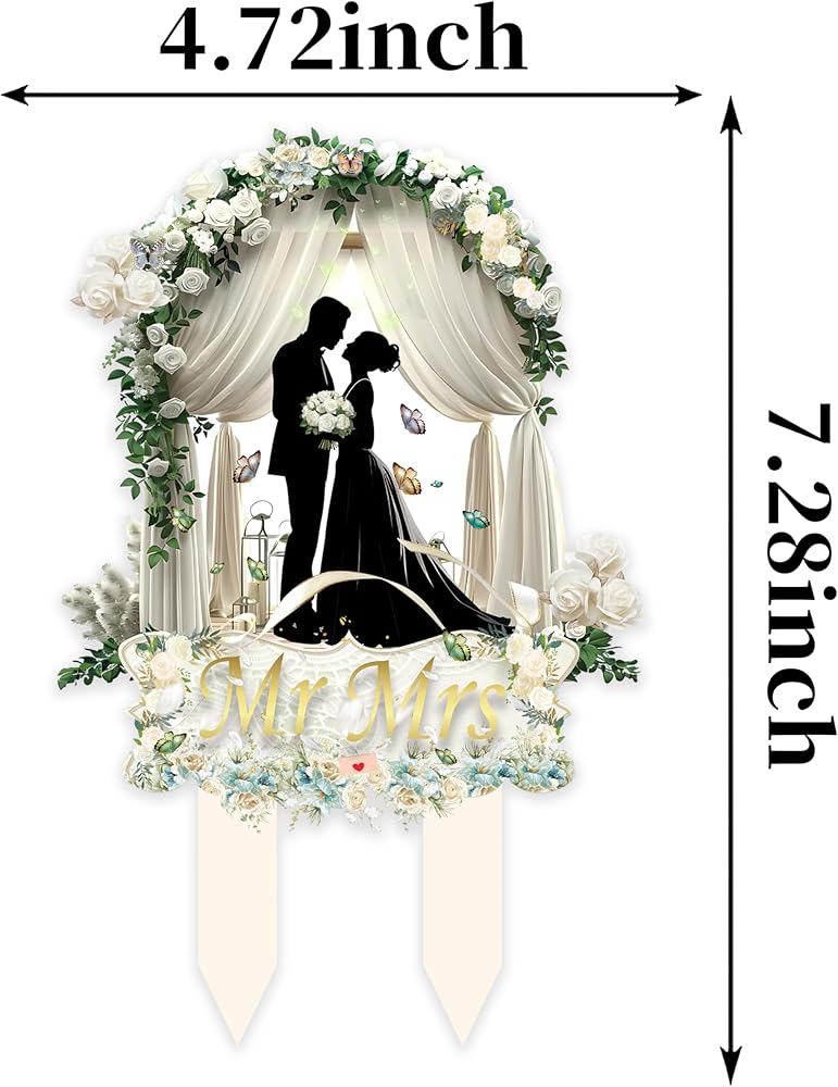 Unique wedding cake toppers material and size:Made of acrylic, with overall color printing, durable and sturdy, able to maintain its complete shape during transportation and placement.Whether it's multiple handling during wedding preparations or long-term placement during cake display, it will not easily deform or fade, and will always maintain a good appearance.H: 18.5cm/7.28inches,W:12cm/4.72 inches.