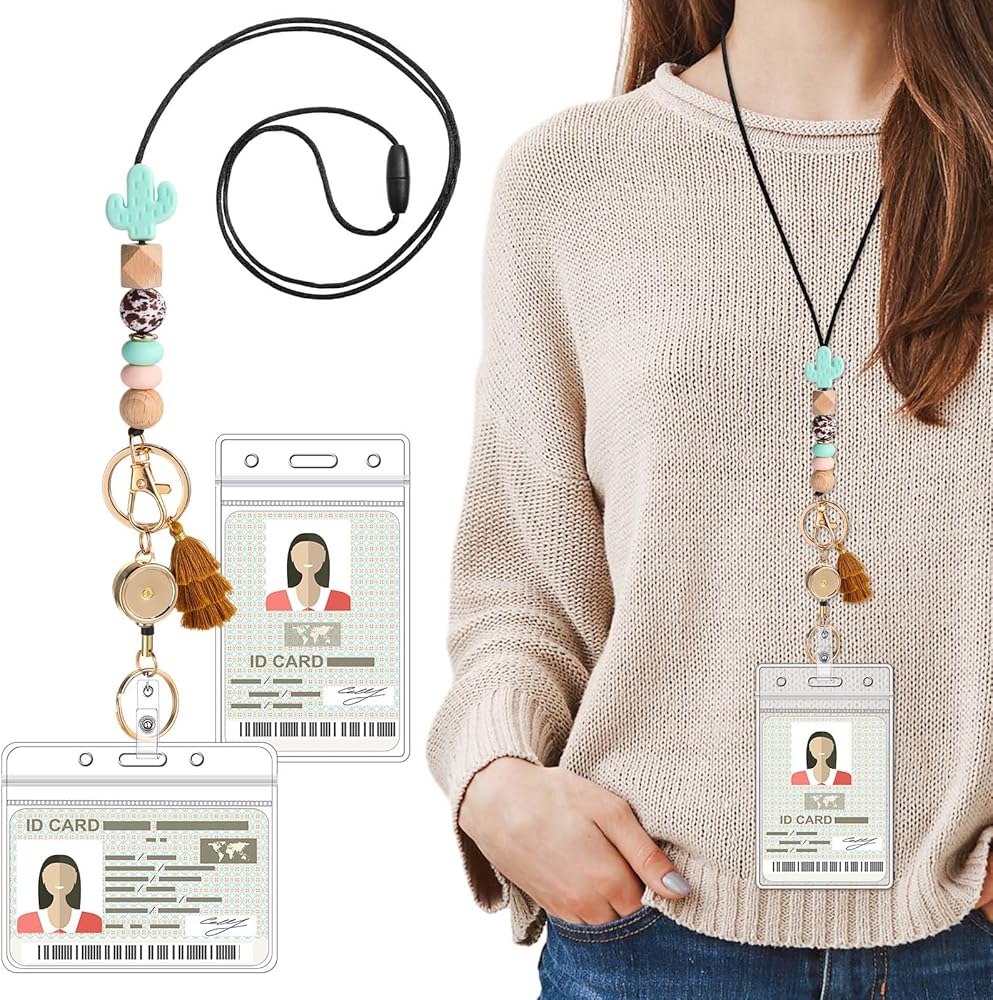 Retractable Lanyard for ID Badge and Key with 2 Waterproof Card Holder Cute Teacher String with Badge Holder and Reel Silicone Beaded for Woman Nurse Office School(Cactus)