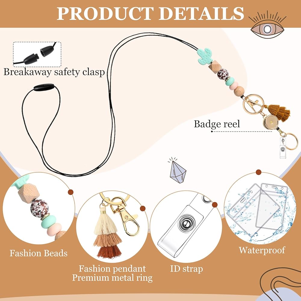 Quality and Safe Materials: the beaded lanyard is made of silicone beads, wooden beads, metal spacers and nylon rope, which is safe and odorless; The tassel is made of quality polyester fiber, which does not fade, and the material is soft and smooth; The badge reel and key ring are made of zinc alloy, which will not fade or rust and can be used for a long time; The waterproof clip is made of quality PVC material, which is non-toxic and odorless