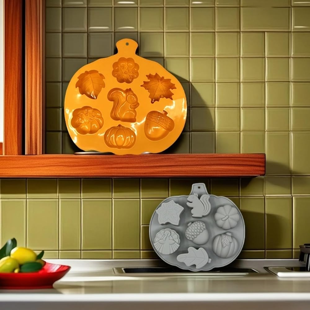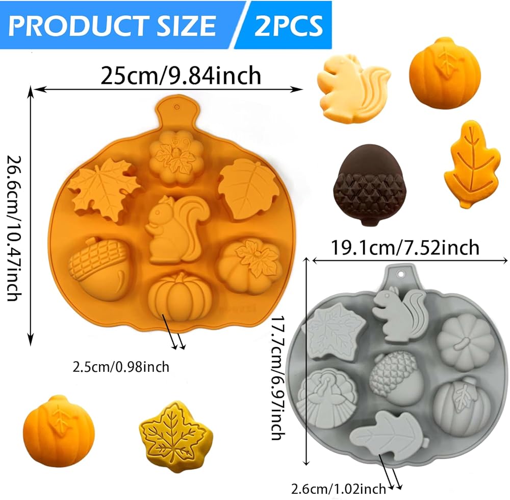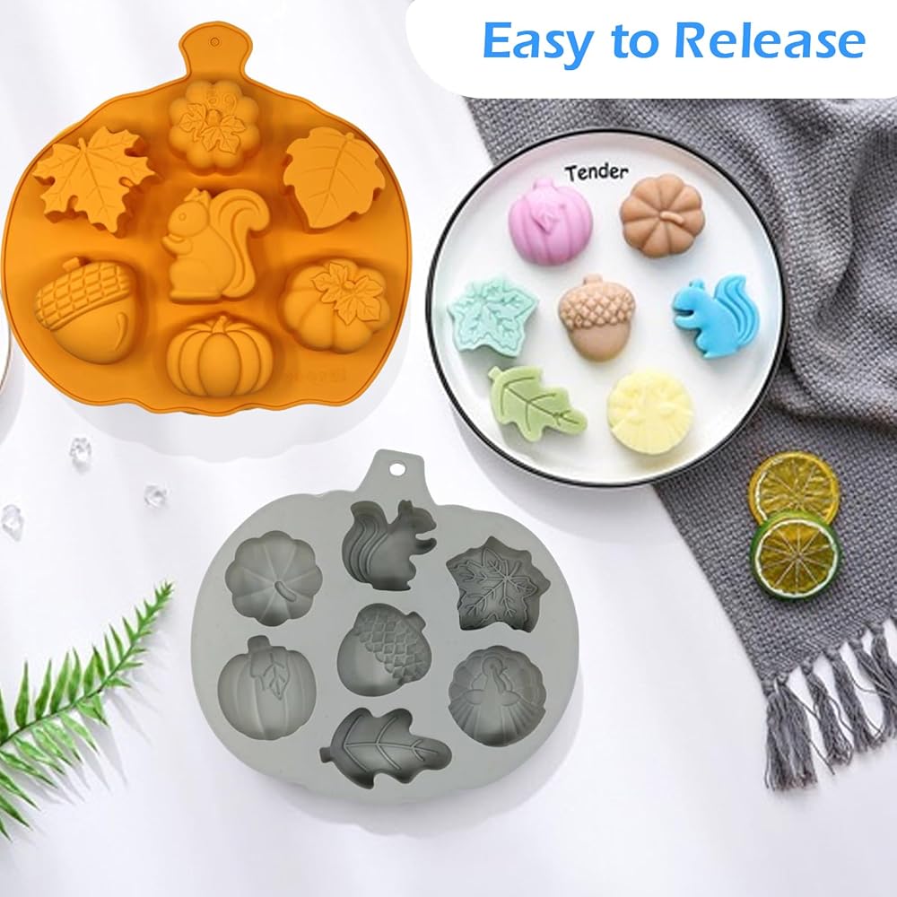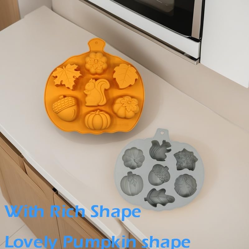 Thanksgiving Fall Silicone Mold - You will receive 2 pcs Thanksgiving fall silicone molds, each mold has 7 different Thanksgiving themed shapes (maple leaves, pumpkins, squirrels, acorns), perfect for DIY cakes, desserts, candles, soaps, and creating a festive autumn atmosphere. Includes 2 pack molds with 7 patterns each, suitable for Fall Harvest, Halloween, Thanksgiving parties
