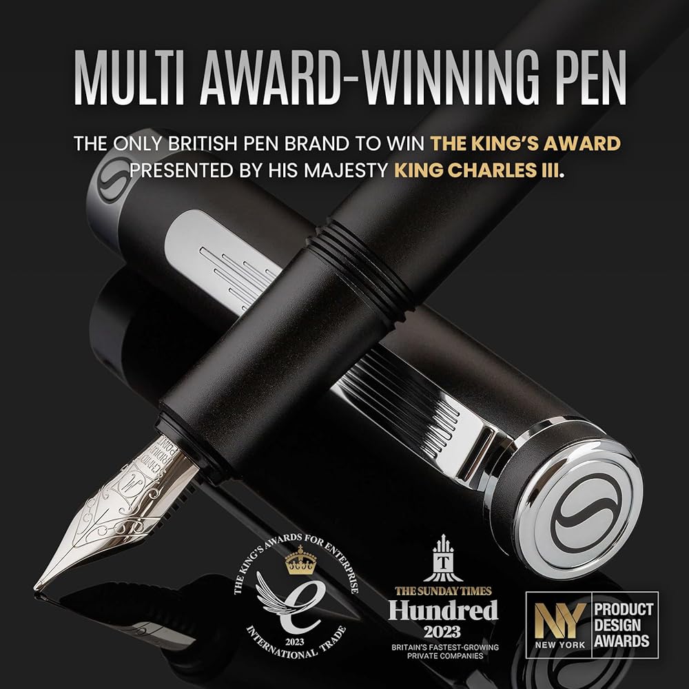 Scriveiner Luxury EDC Fountain Pen (Medium), Stunning Matt Black Pocket Pen, Chrome Finish, Bundle with Fountain Pen Ink Cartridges - Black & Blue - 20 Standard International each box, Made in UK