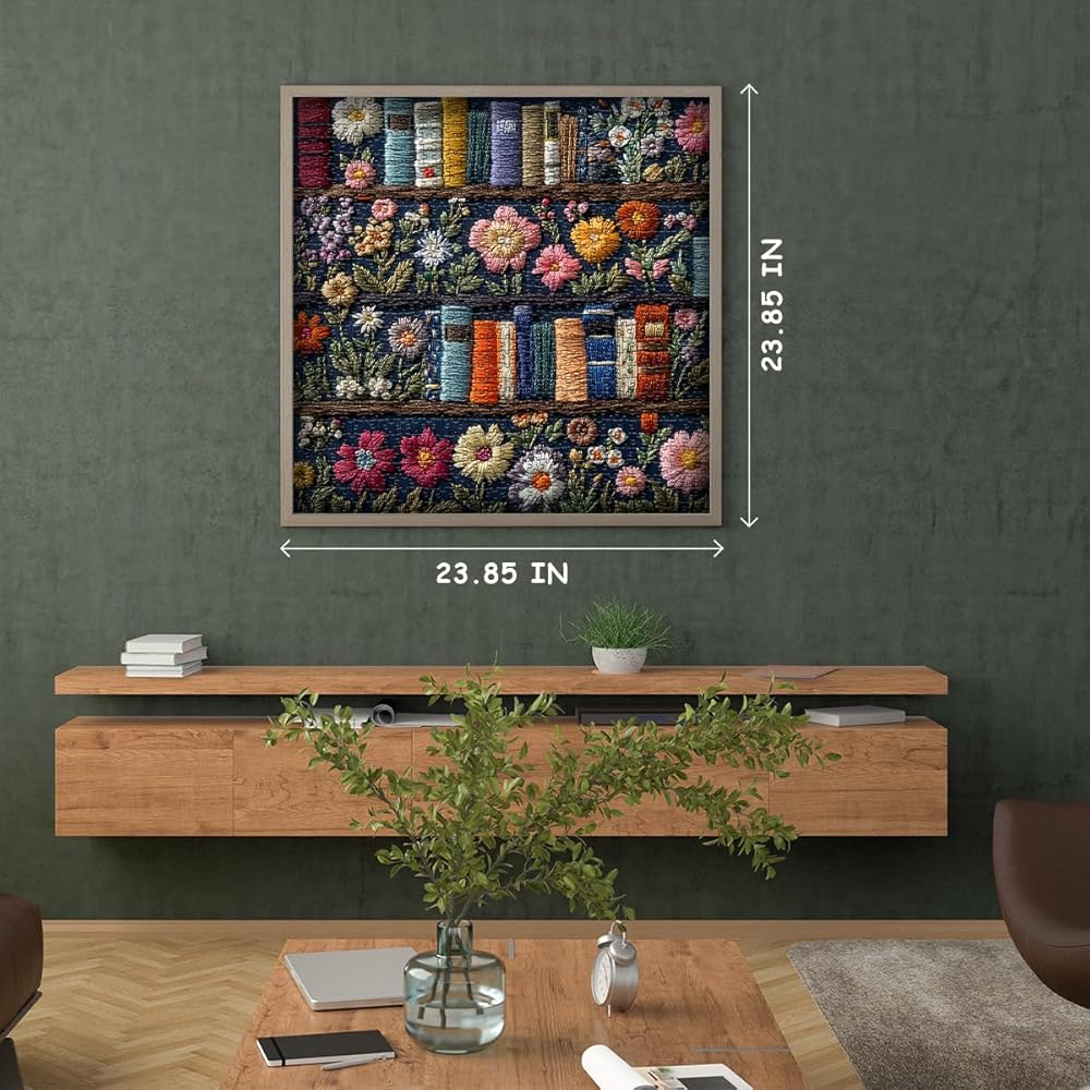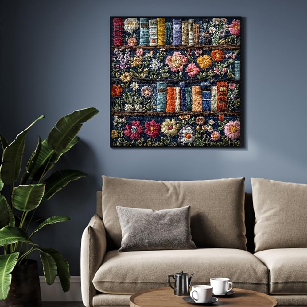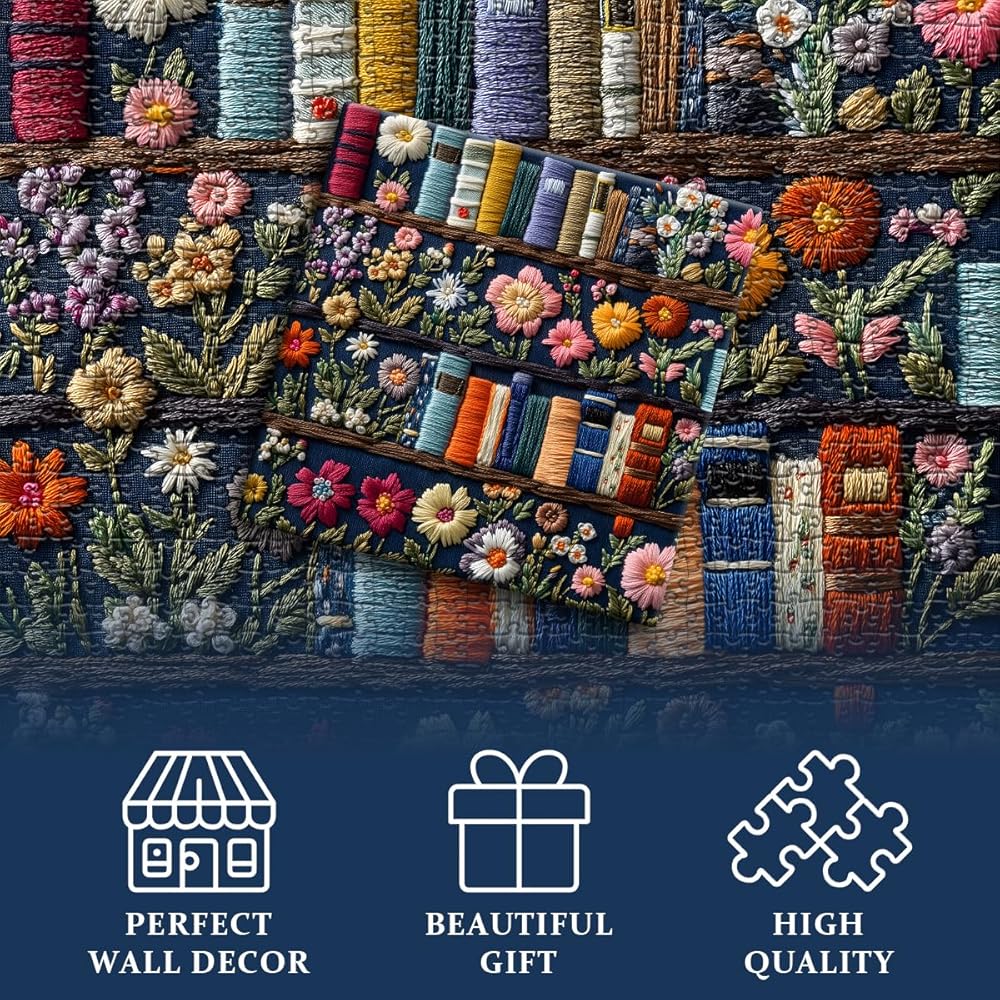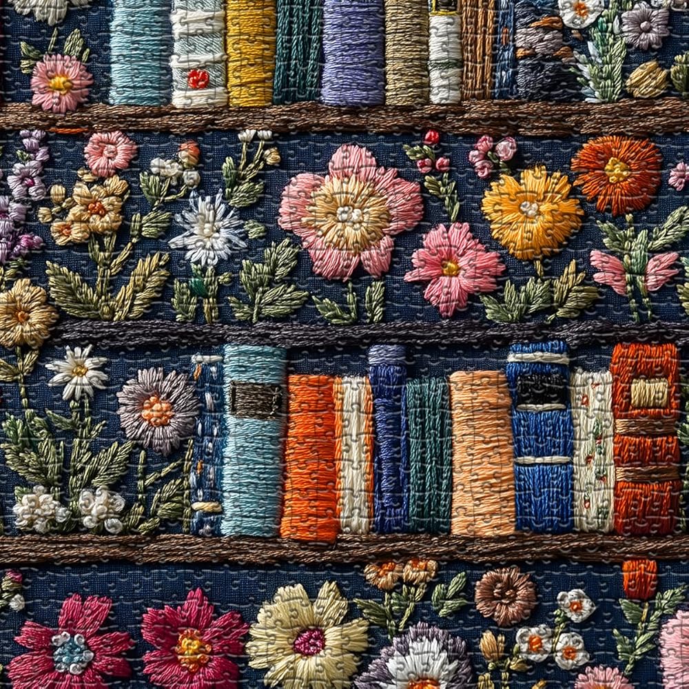 Wildflower pages jigsaw puzzle 1000 pieces : This flower puzzle 1000 pieces shows beautiful embroidery design, a vibrant bookshelf filled with colorful books and wildflowers. The bright colors are offset by the detailed floral pattern