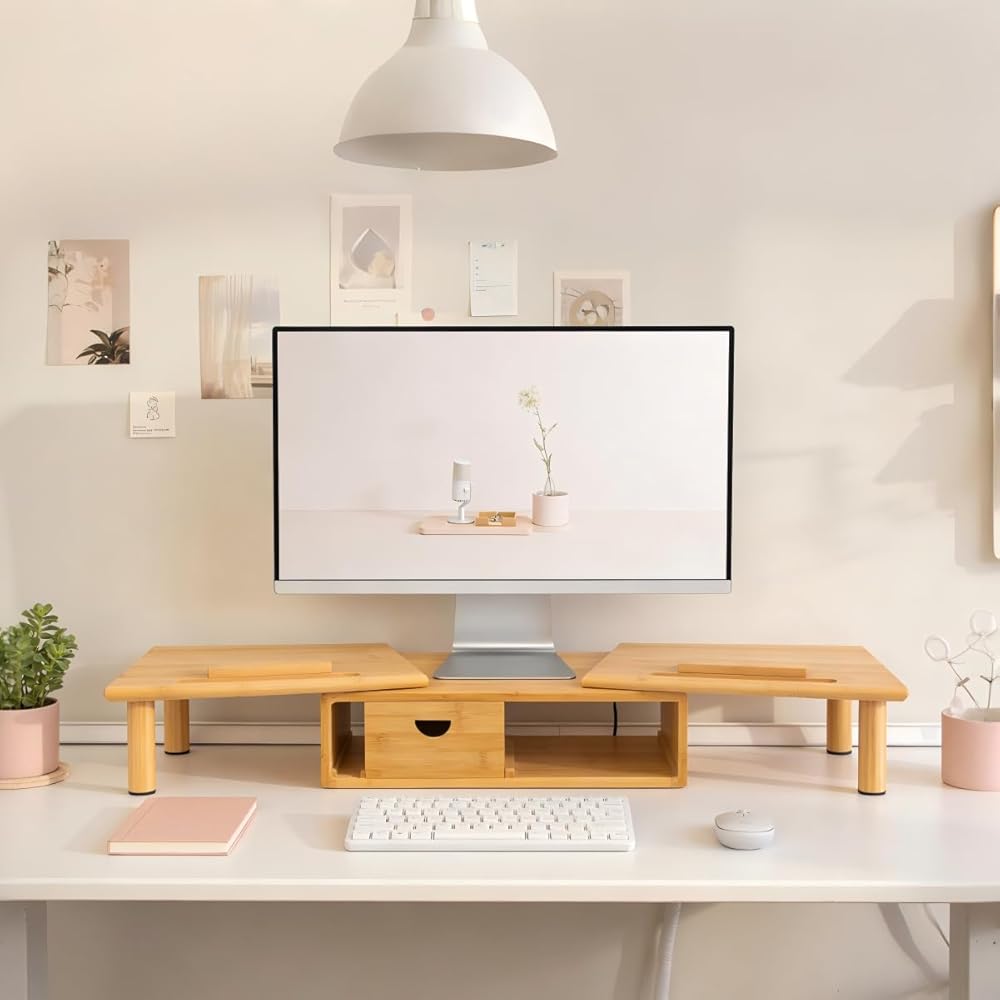 Dual Monitor Stand Riser with Drawer for Desk Laptop Desk Shelf with Adjustable Length and Angle, Bamboo Computer Stand Riser for 2 or 3 Monitors Screen Laptop PC TV -Natural