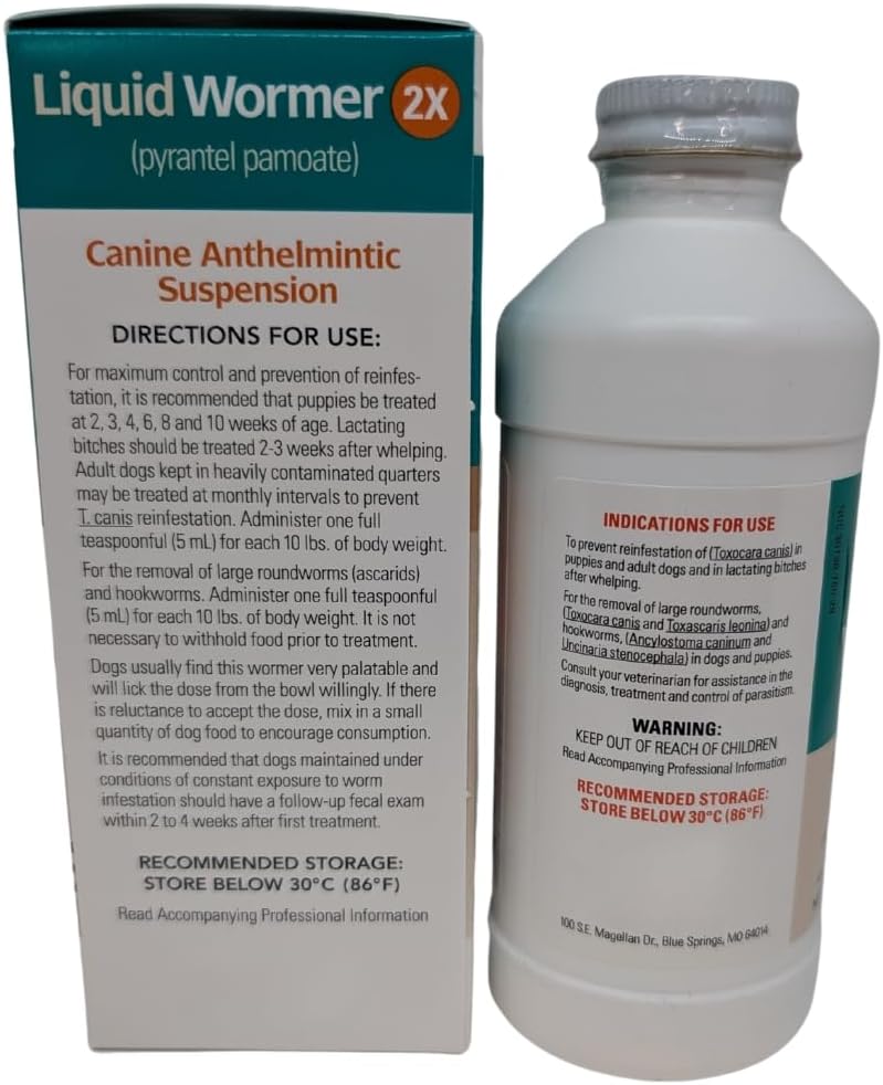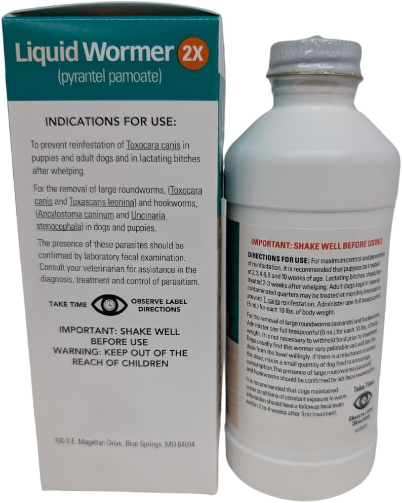 Double Strength Formula – This Liquid Wormer 2X contains pyrantel pamoate for dogs (4.54 mg/mL), effectively targeting large roundworms and hookworms in puppies and adult dogs.