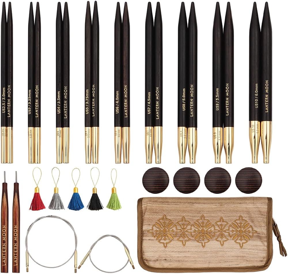 The needle tips of these interchangeable circular needles are made of Ebony, one of the world's most expensive wood. The liquid-silk finish on the lightweight needles, plus the 24K gold finish on the brass connector guarantees snag-free knitting. The smooth cords ensures no twist and lies flat when stored. Smoothly honed and shaped needle tips work well with all yarns. This package contains one pair each of interchangeable tips in sizes 2.5/3mm, 3/3.25mm, 4/3.5mm, 5/3.75mm, 6/4mm, 7/4.5mm, 8/5mm, 9/5.5mm, 10/6mm, 2 swivel cords and 2 fixed cords each in 16- and 20-inch lengths, 4 wooden end caps, 2 tightening tools, 5 colorful tassel stitch markers, and a silk case with embroidered floral motif. Imported.