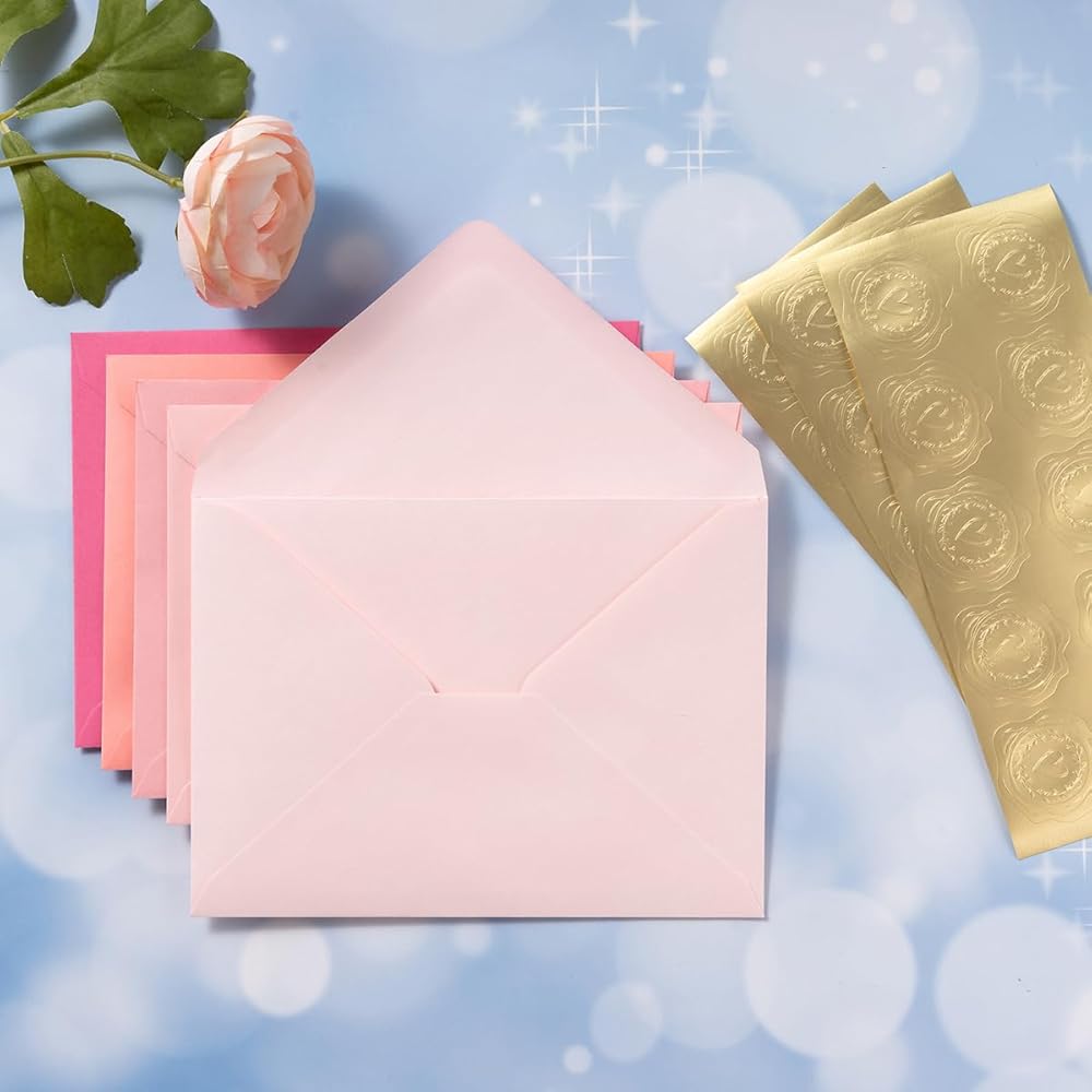 Package Includes: 50 envelopes in 5 colors, 50 folded cards in matching colors, and 50 decorative gold stickers for elegant finishing touches