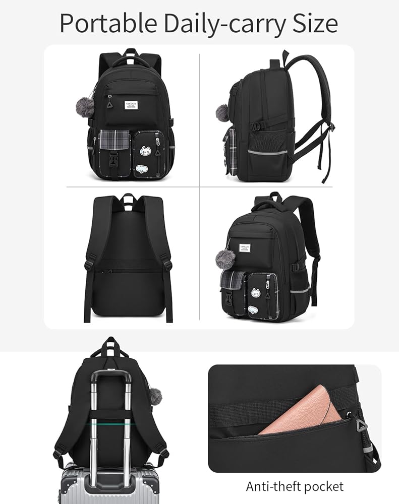 School Backpack for Teen Girls, Big Student Laptop Backpack Aesthetic Bookbags for College Women Elementary Middle High School Travel Mochilas Escolares, Black