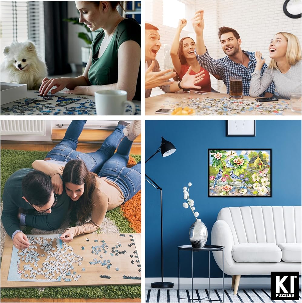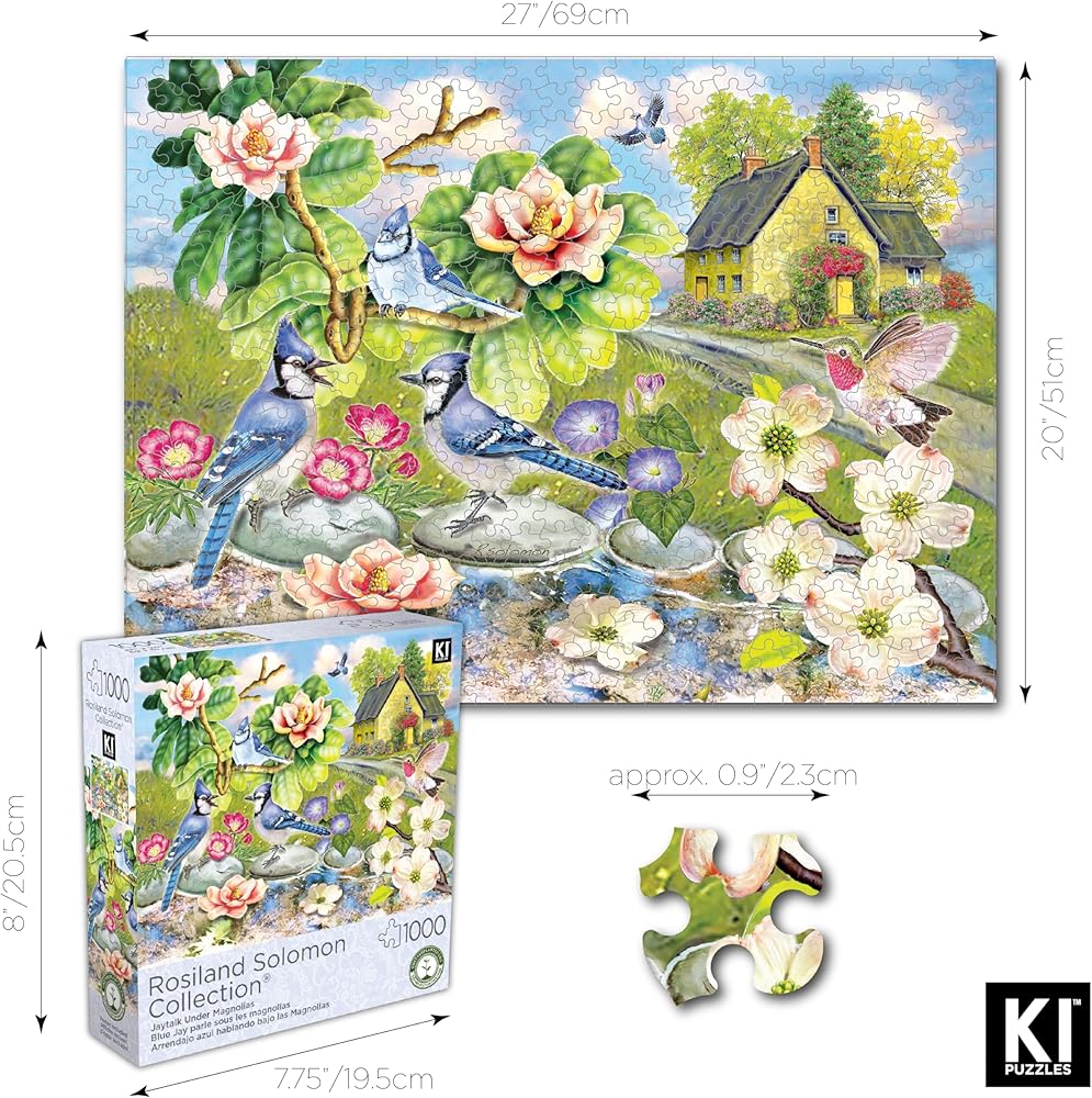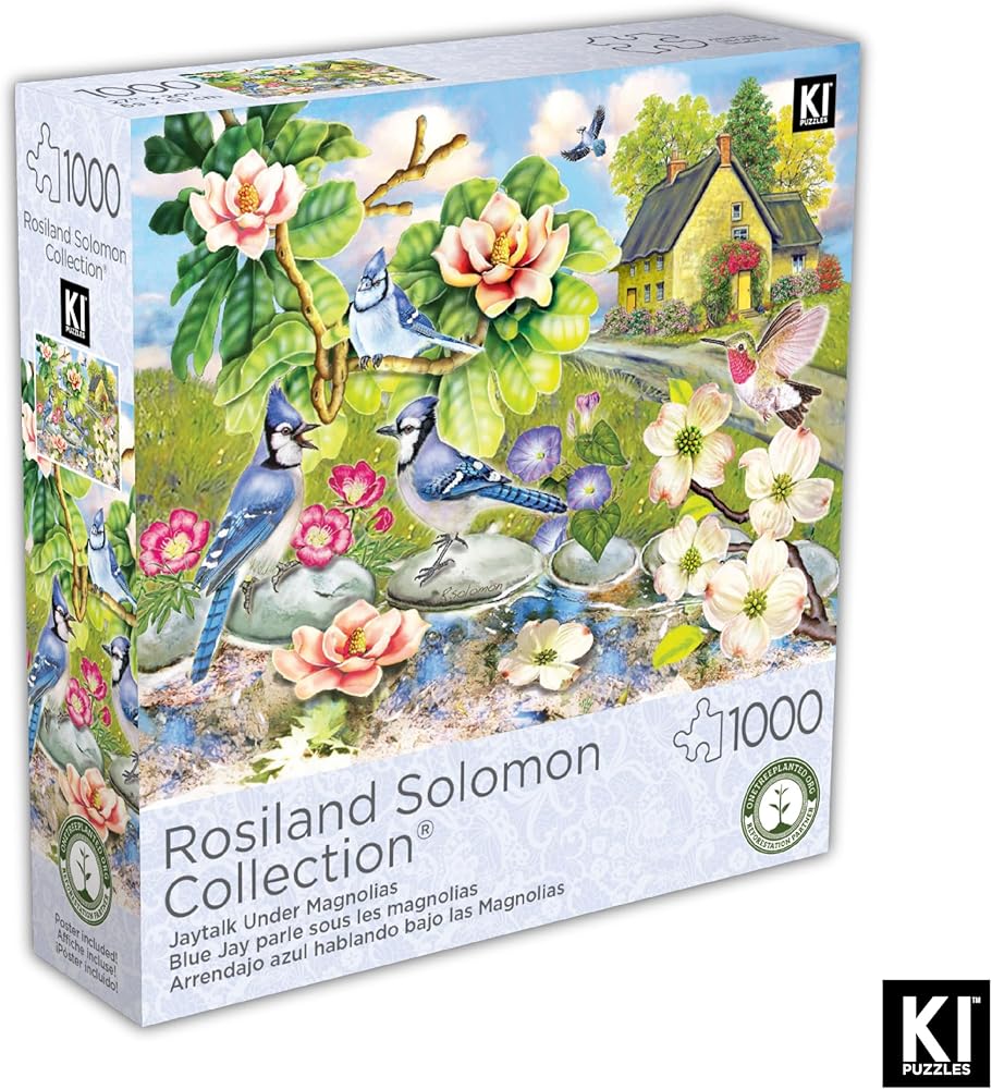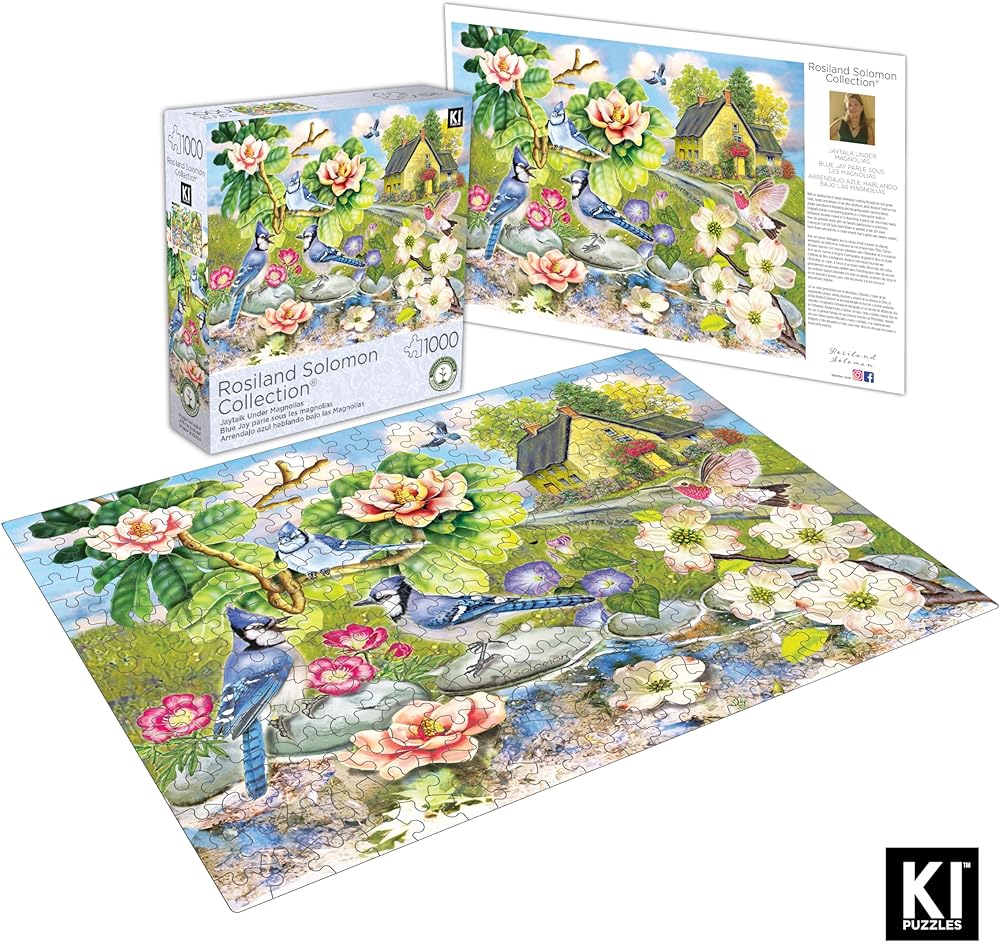 Includes a 1000 piece quality cardboard jigsaw puzzle of a colorful and detailed piece of art featuring a bluejay bird in a magnolia tree with a cottage in the background "Jaytalk Under Magnolias" from charming artist Rosiland Solomon. This colorful puzzle will delight with its whimsical artwork. This snugly interlocking jigsaw puzzle is made from quality, thick recycled paper board, printed using vegetable-based inks, and is 27x20” when complete. It is packed in a sealed plastic bag with very low puzzle dust. A full color poster reference guide is included for easy reference as you relax, kick back and enjoy "bird watching" while you assemble the beautiful and colorful puzzle! About the artist: With an abiding love of nature developed roaming through the lush green fields, forests and streams of her Ohio childhood, artist Rosiland Solomon has always specialized in illustrating and designing nature-based products. Rosiland began her career as an illustrator of science and reading textbooks, and after designing and illustrating thirteen other children's books, she moved into illustrating and designing for a diverse group of clients. Rosiland has a BA in Sociology and English, and learned airbrushing in Hollywood in 1978, where she survived an old-fashioned apprenticeship at an all male Movie Poster Art Studio in Hollywood's Crossroads of the World. She still works in airbrushed gouaches, doing a great amount of detail work with pencils, prismacolors, and tiny brushes as well as working in her more recently acquired favorite media of scanning her drawings into Photoshop, and painting with whatever brushes (watercolor, oils, or airbrushed paints) she feels are most appropriate for that design, frequently creating results similar to oil or acrylic painting.