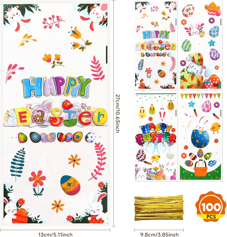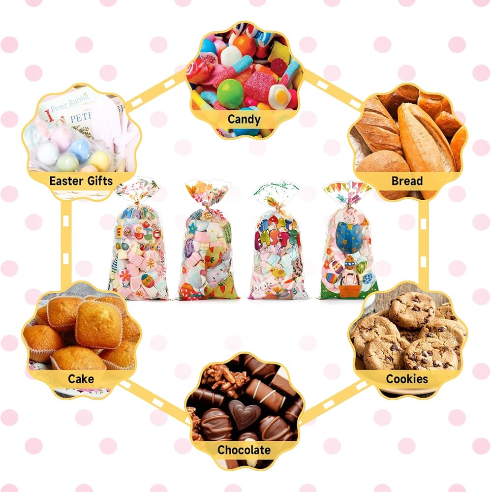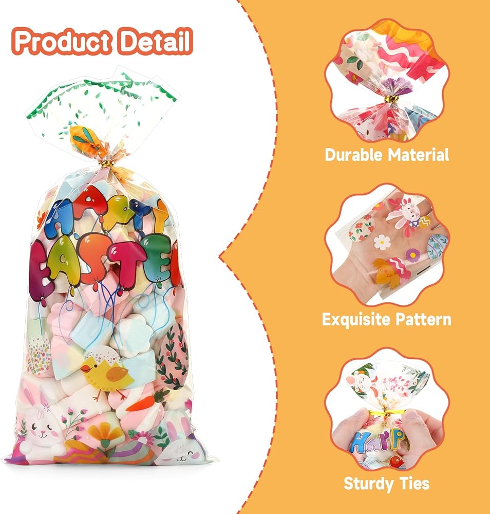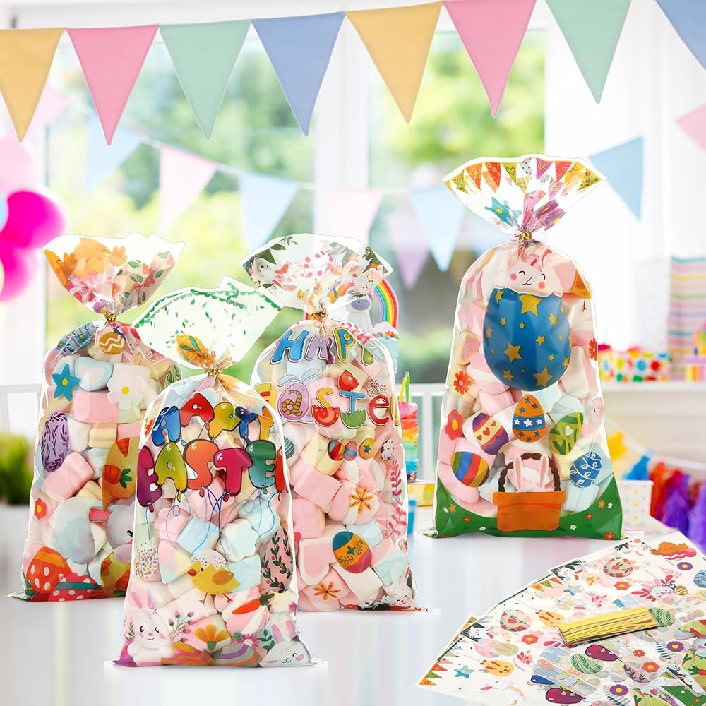 Make your Easter celebrations extra special with these delightful PintreeLand treat bags! Each set includes 50 cellophane bags featuring four charming Easter designs, complete with adorable bunnies, colorful eggs, spring flowers, and festive 'Happy Easter' messages. Perfect for packaging candies, cookies, small toys, or party favors, these clear bags showcase your treats beautifully while keeping them fresh and protected. The included gold twist ties ensure secure closure and add an elegant finishing touch. Each bag displays whimsical artwork with cheerful spring motifs, making them ideal for Easter egg hunts, classroom parties, or holiday gift-giving. The transparent design lets the contents shine through while the decorative patterns add a festive flair. These versatile bags are just right for creating memorable party favors or thoughtful holiday gifts that will bring smiles to children and adults alike. Whether you're planning an Easter celebration at home, school, or church, these treat bags will help make your event more memorable and organized.