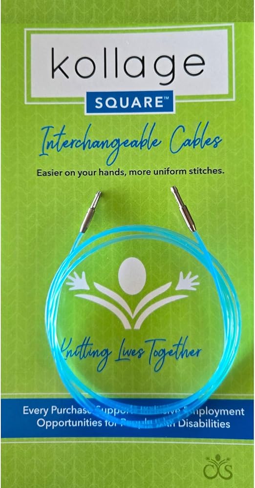Interchangeable Cables, available in 6 different sizes, both in soft and firm. Tips sold separately. Kollage Interchangeables use a patented click-together system and Kollage needles are the Original Four Sided Knitting Needles. Only to be used with the patented Kollage Interchangeable connection system - Easy click together and release. The cable swivels 360 degrees. The Unique Square shaped needle used with the cable has superior joins, precise points and smooth joins that swivel. A relief to tired wrists and helps create more uniform stitch gauge. Please note: Total length is achieved when tips and cord are joined together. The needles and tips are made of a high grade aluminum have precise points which are excellent for fine yarns such as fingering yarn, sock yarn and lace yarn. Kollage knitting needles originally became known for the Square shape which are easier on your hands while producing a more even stitch gauge. Each needle is laser etched with size and length. Made in Canada. Due to the difference in Square needles compared to traditional round needles, we STRONGLY, recommend you knit a swatch gauge. Please Note - most knitters go up one needle size in circulars and DPN's to obtain gauge.