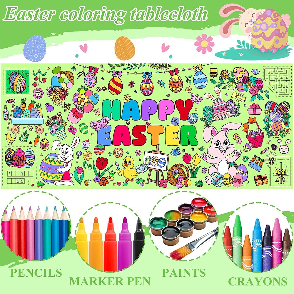 Cute theme design: Our Easter coloring tablecloth with various Easter elements like bunny, chicken, flower, egg, etc. In addition, there are various interesting games such as finding differences, mazes, word searches and more. It's suitable for kids' gatherings and provides them with fun activities