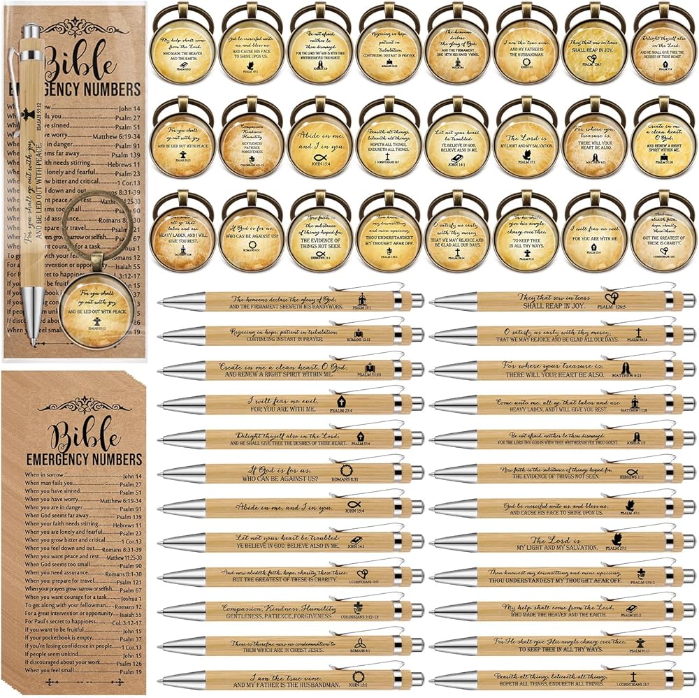 25 Sets 75 Pcs Christian Mothers Day Gift Bulk Bible Verse Pens Emergency Numbers Bookmarks Scripture Keychains for Women Church Baptism Fathers Day Souvenirs(Wood Color)
