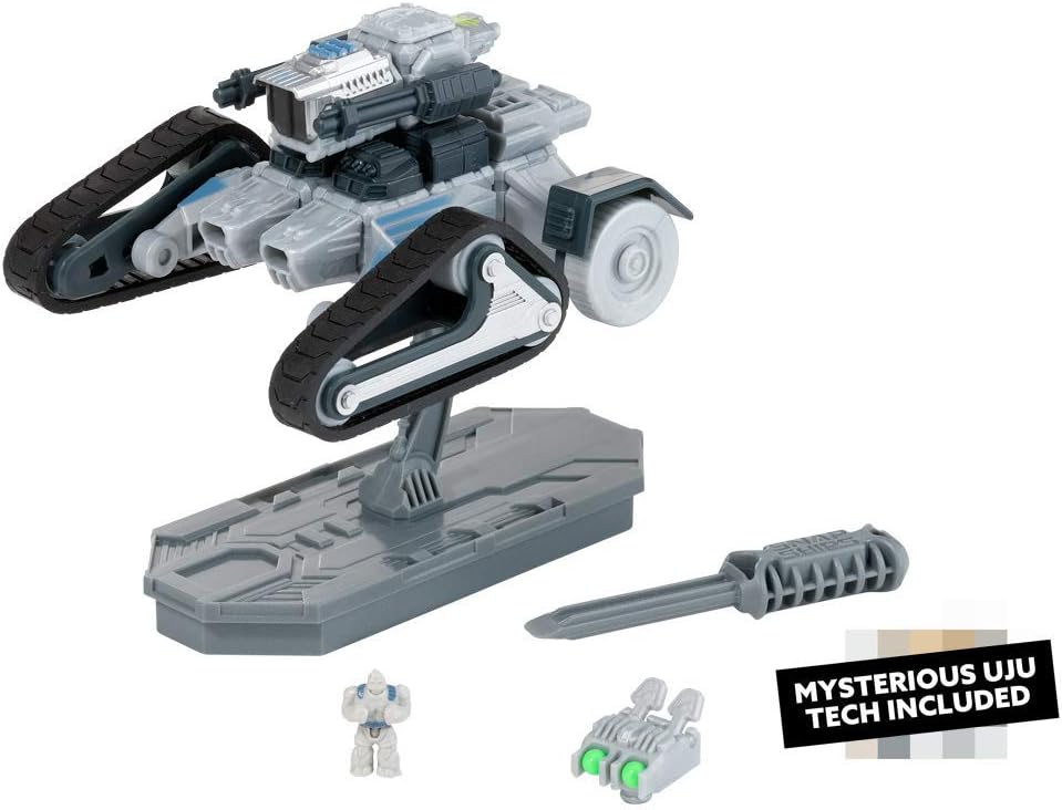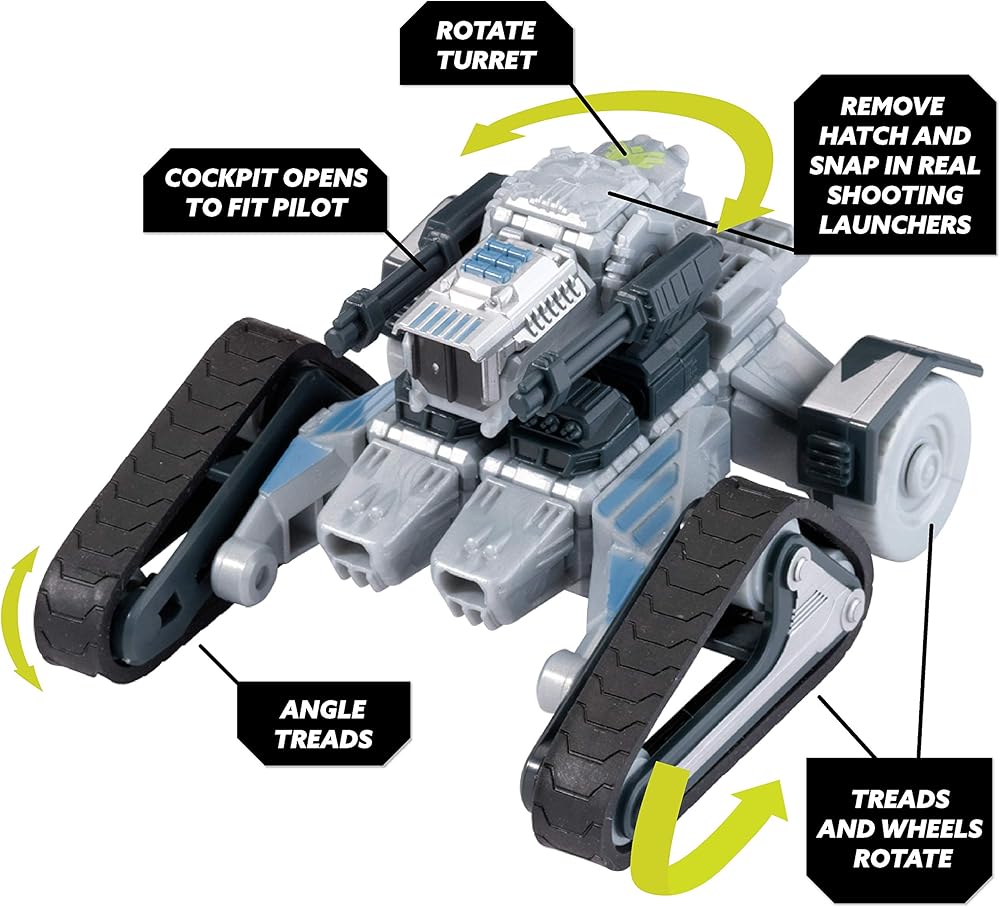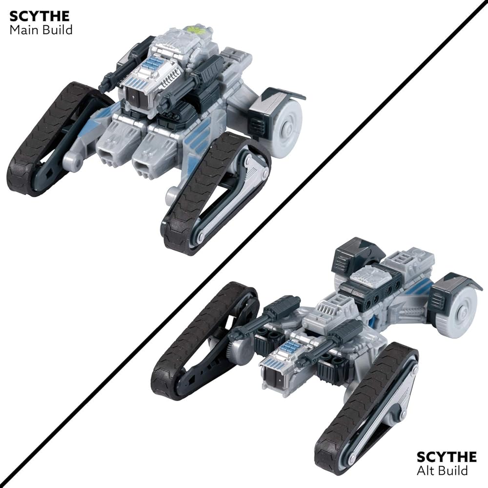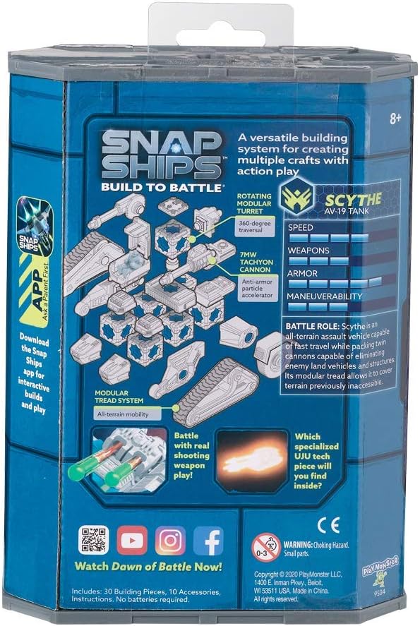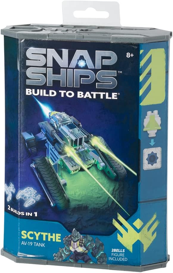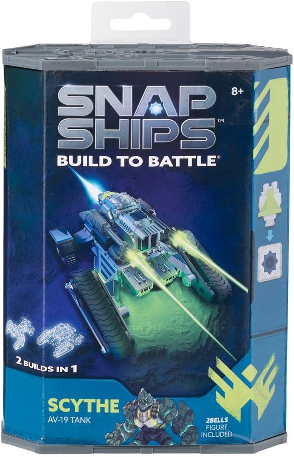 Welcome to the future…where humanity is under constant attack from a brutal alien threat. The Komplex spreads through the galaxy and growing stronger with each species they defeat and assimilate. To fight them, humanity relies on an elite team, the Forge, who pilots their own armada of spacecraft known as Snap Ships. Now YOU can Build to Battle! Snap Ships is a versatile building system for creating multiple crafts with action play, and all sets and pieces are interchangeable, so kids can build however they want. The Snap Ships set for Scythe includes instruction for two different builds that you assemble yourself and then engage in battle with real shooting weapon play! Scythe AV-19 Tank is an all-terrain assault vehicle capable of traversing previously inaccessible terrain. With 2Bells, the Forge's alien crew member, in the driver's seat, it's sure to be an adventurous ride! Add the mysterious UJU tech piece that's included, and you're sure to defeat the Komplex! Download the free Snap Ships app for more action play and more ship build ideas! All Snap Ships sets are modular and designed to be combined to build whatever you can imagine! Includes 30 Building Pieces, 10 Accessories, Instructions; no batteries required