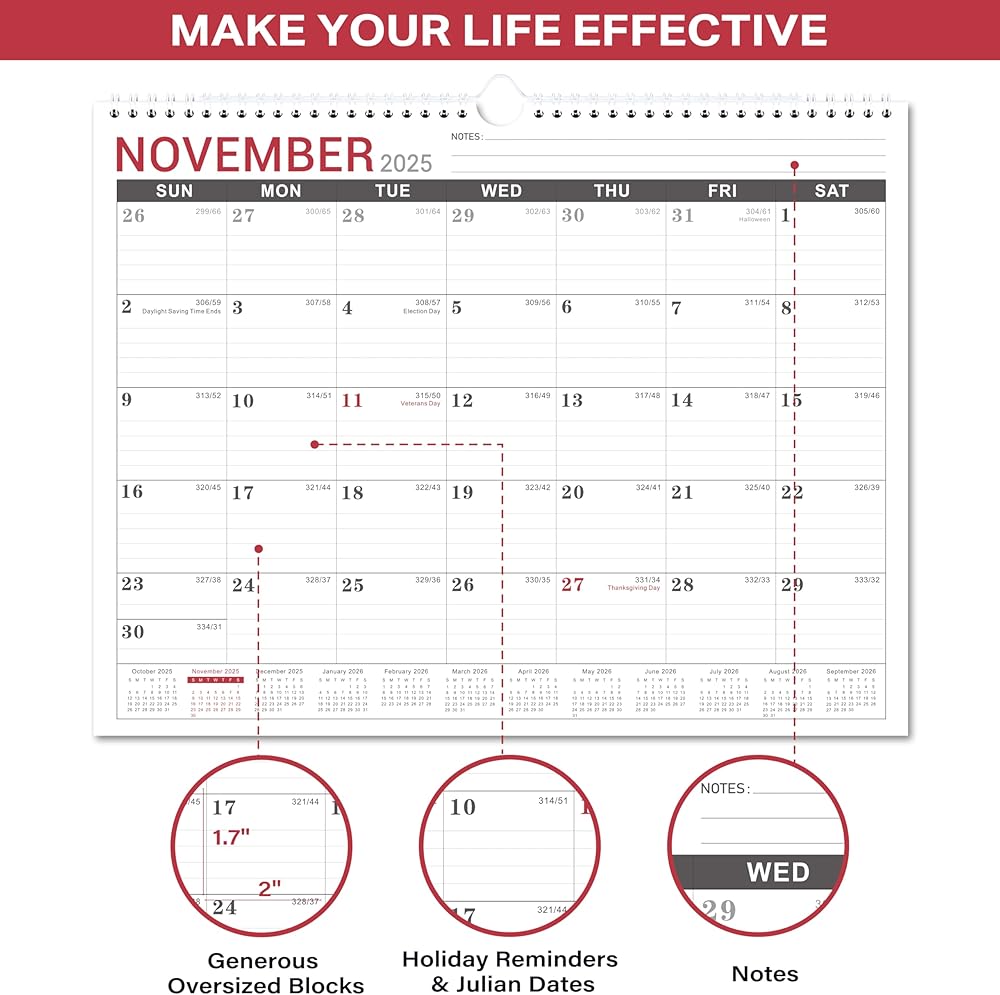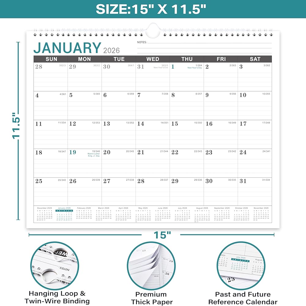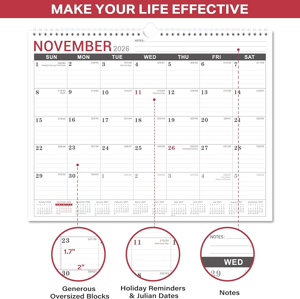 2026-2027 Wall Calendar - 2026 Calendar Wall from Jan. 2026 to Dec. 2026, Monthly Calendars with Large Ruled Blocks and Julian Dates, Calendars for Easy Planning, 11.5''x14.75''