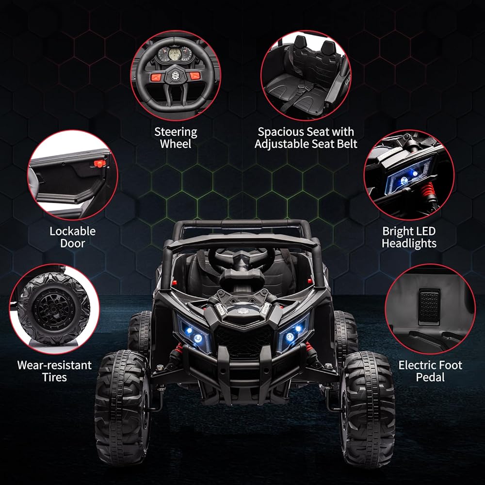 Stylish Design: This ride-on UTV car features a sleek and realistic appearance, complete with LED lights, wear-resistant EVA wheels, MP3 player, and a flash drive port. The fully opening and closing doors add to the authenticity of the driving experience.