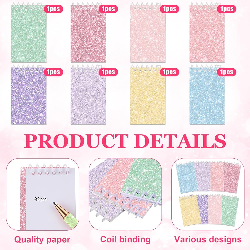 Quality Material: these colorful glitter pens are made of stainless steel pen tubes, metal copper holders and black ink replaceable refills, look stylish and pretty, comfortable to hold and reliable to use, not easy to break or deform, can serve you for a long time; Mini spiral notepads are designed with assorted bright glitter covers, which look shiny and glittering, there are 20 blank sheets in each book, suitable for writing or journaling