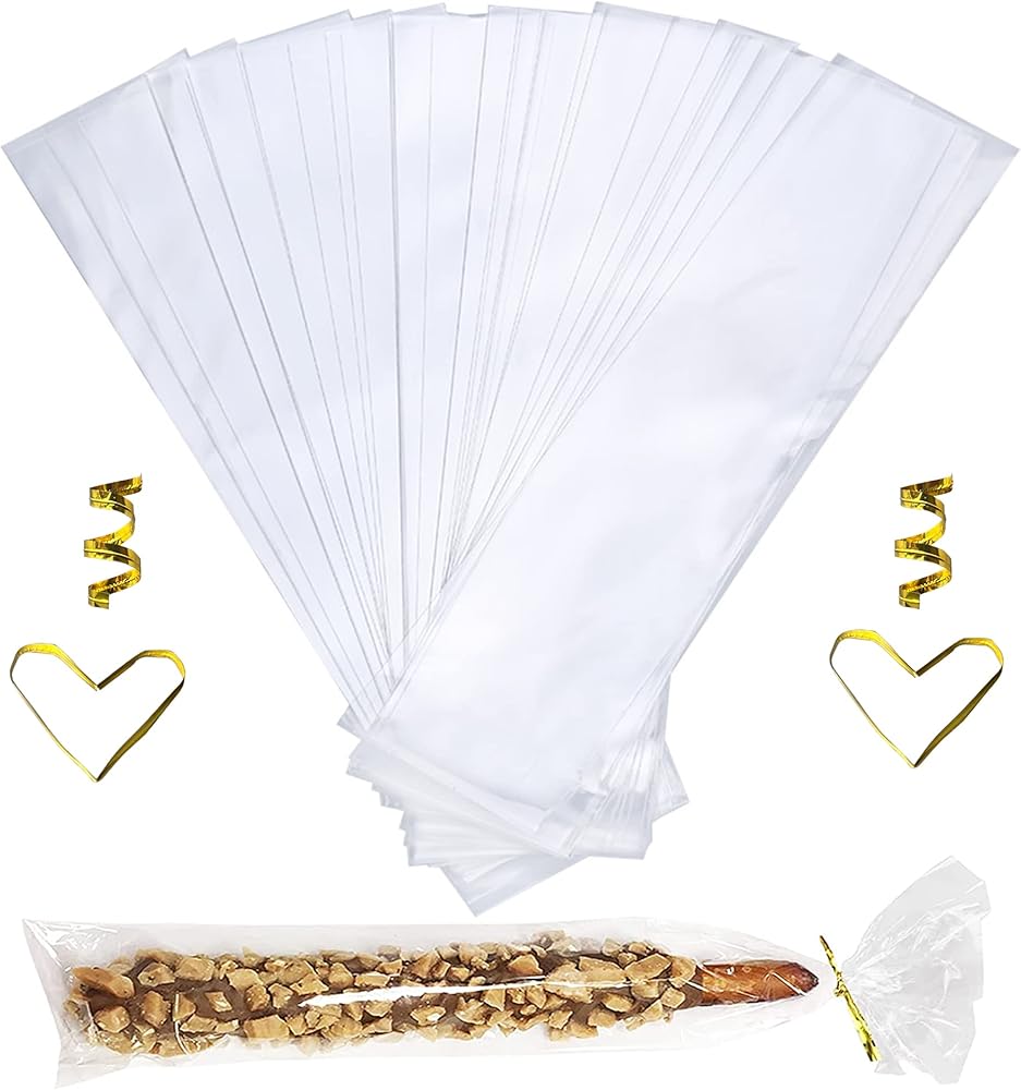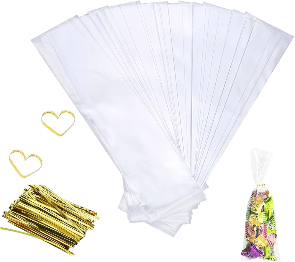 Clear cellophane treat bag: Flat bag, 4 inch by 9 inch; 70 Micron thick with 200 PCS Metallic twist ties: Gold, 2mm*80mm