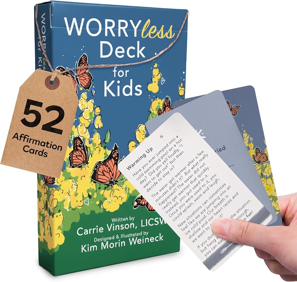 Kickstart your child's emotional growth with our Worry Deck for Kids. A fun and interactive way to build confidence, tackle anxiety, and nurture vital social skills that will stay with them for life. With each card, your child will discover new ways to manage emotions, express themselves, and face challenges with courage. Watch as they gain the tools to navigate life's ups and downs, growing emotionally resilient with every use. Fun Emotional Growth Make emotional growth an adventure your child can't wait to join with our therapy card deck. Packed with fun and beautifully illustrated cards, it helps your child master coping skills for kids while creating meaningful, enjoyable moments. Confidence That Sticks Give your child the tools to face big feelings with calm and clarity. This 52-card therapy card game makes self regulation for kids fun and easy to learn. Whether at home, in school, or during therapy. Watch them grow more resilient with every card they play. Build Brighter Mindsets Support your child's emotional well-being with feelings cards that inspire positive thinking and self-awareness. These calming activities for kids turn emotional learning into a joyful, empowering experience for both of you. Real Conversations Start Here Use these playful feelings cards for kids to spark open talks and connect on a deeper level. With the help of one of our therapist tools, your child learns to recognize emotions, name their feelings, and manage stress with confidence. Create Calm Moments Guide your child through simple breathing exercises, visualization, and self-talk to unlock a sense of calm. With our calming tools for kids in their daily routine, they'll feel empowered to manage their emotions and face challenges head-on. Start your child's emotional growth today with our Worry Deck for Kids. Order now and empower them to build lasting confidence and resilience.
