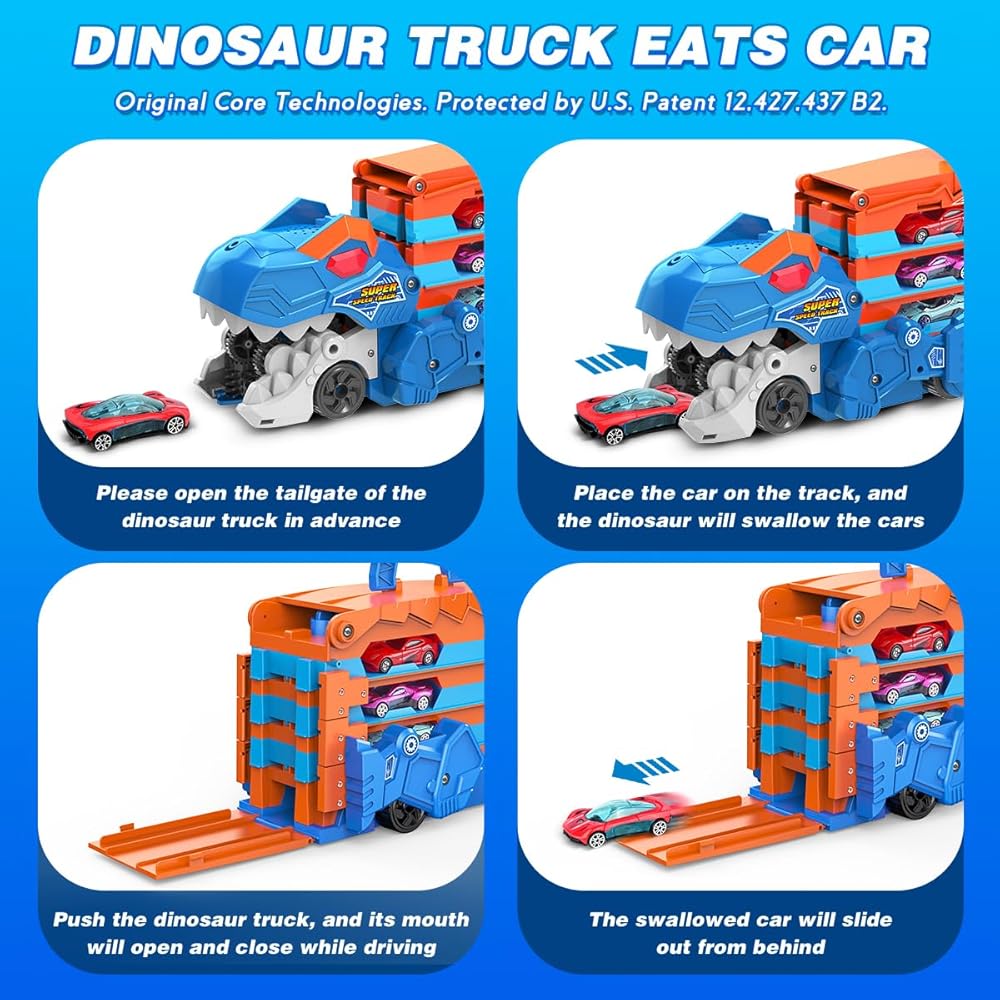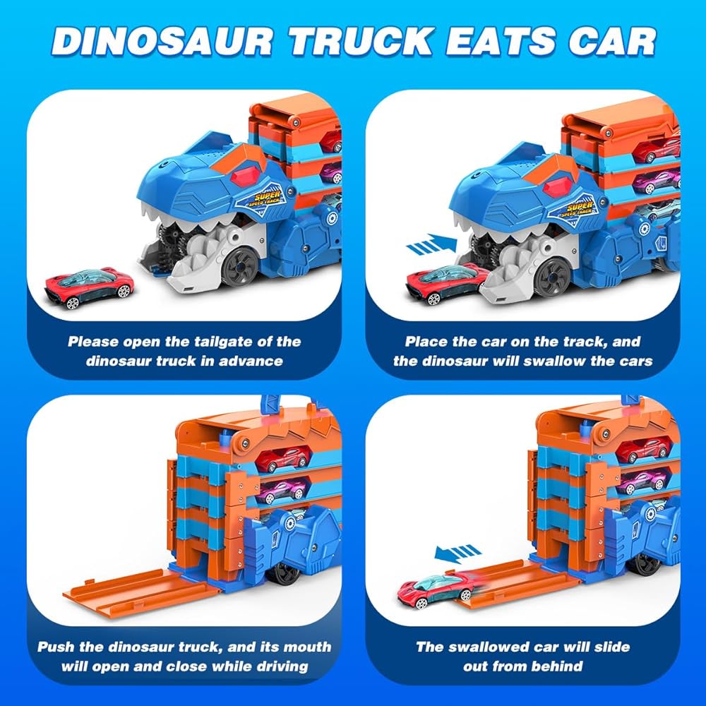 🚚CREATIVE DESIGN & EASY TO USE: Upgraded dinosaur transport truck features drawer-style folding design, complete with dinosaur sounds, place the car in front of the dinosaur truck, roll this realistic dinosaur truck toy, watch it devour up to 4 small cars along the way while escaping through the open tailgate, enjoy the thrilling action scene. This dinosaur truck will not only capture your child's attention, but also their hearts