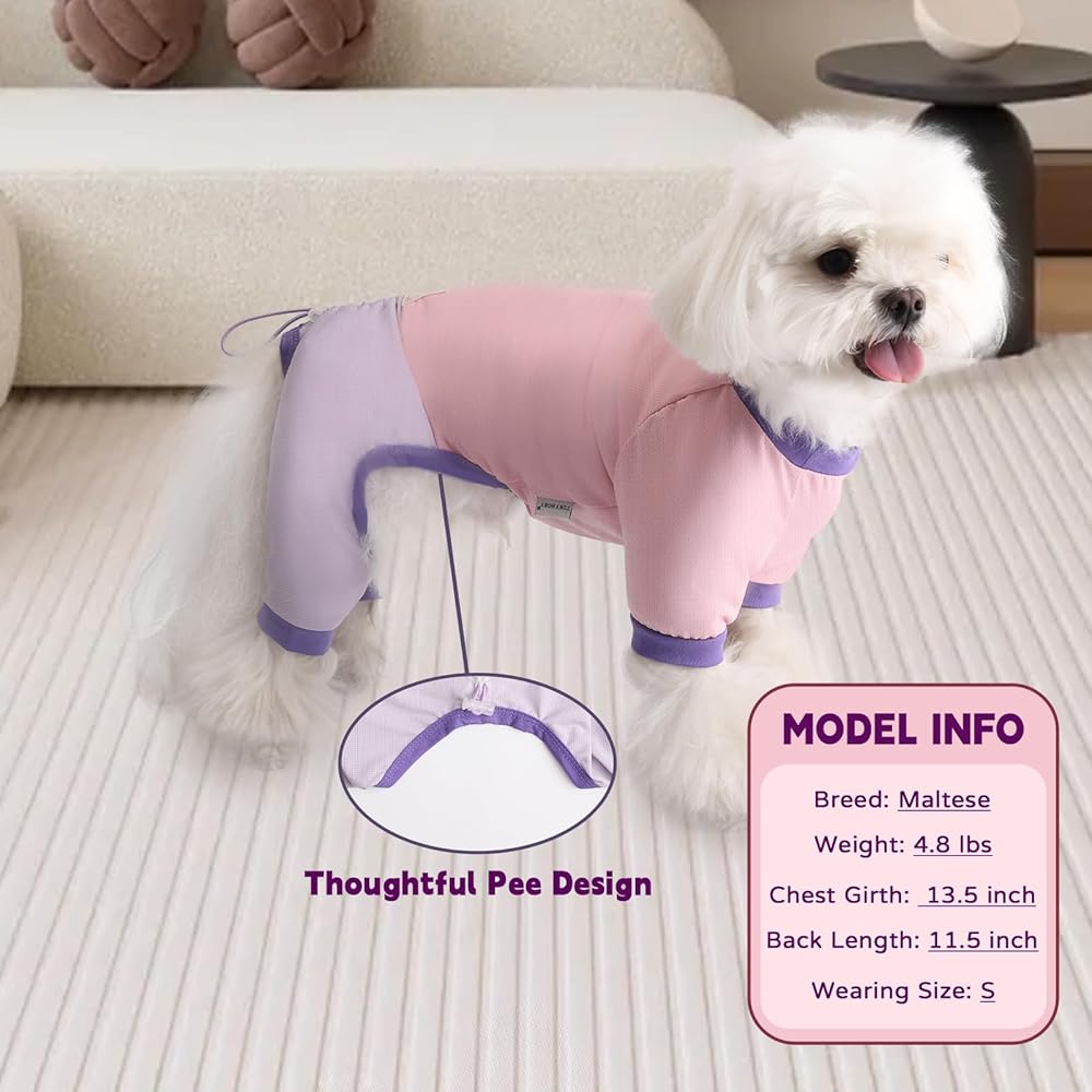 【Easy to Wear and Take Off 】The puppy clothes adopt pullover design, which is easy to pull-on/off. Boy girl dog clothes have an open belly crotch for easy potty breaks without removing the pajamas. Round neckline, ribbed elastic cuffs and 4-legged design, your pup stays comfy all day. Adjustable drawstring for better back length control to fit your furry partner. The lightweight and stretchy fabric allows dogs to jump, run, sit, sleep, and other movements without any limitations.