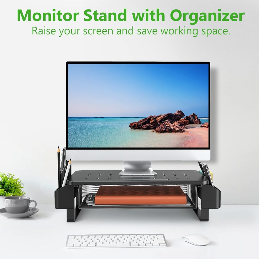 3 Height Adjustable - This ergonomic computer monitor riser with drawer raises your screen at a comfortable eye-level (4.13”/ 4.92”/ 5.71”). Effectively improve posture to relieve eye-strain, back & neck pain throughout the workdays.
