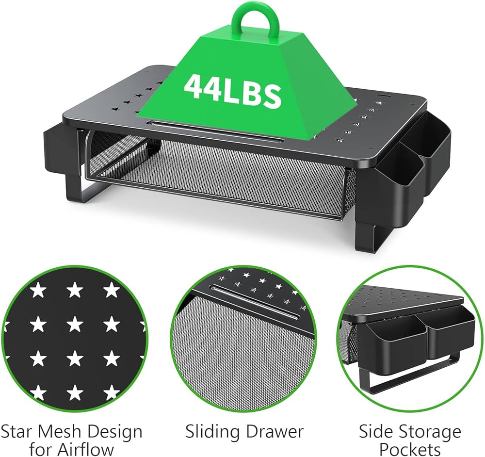 Sturdy Material and Special Design: Computer stand for desk is made of premium metal material for long-lasting usage time, which can meet your daily requirement to hold most office devices. The maximum load capacity is 44lbs. Star mesh pattern design improves airflow for your device.