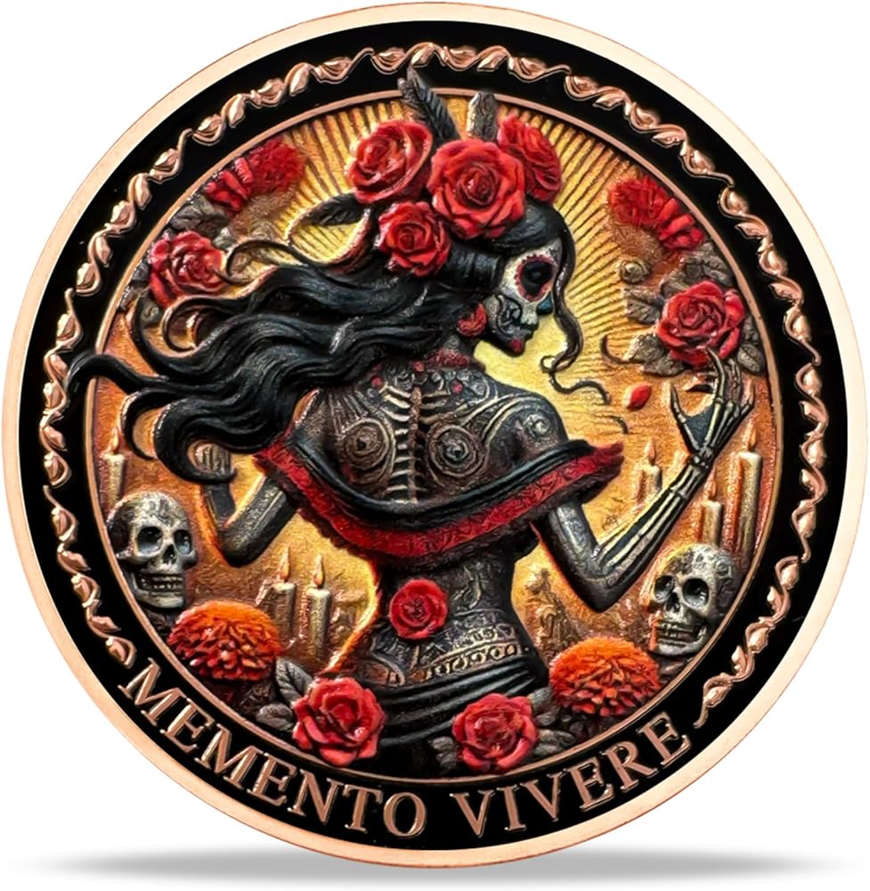 Inspirational Reverse Motif: The reverse side of the Memento Vivere coin captures the essence of "Memento Vivere" (Remember to Live) with a skeleton riding a carousel, surrounded by red roses and skulls.It encourages joy and the celebration of every moment