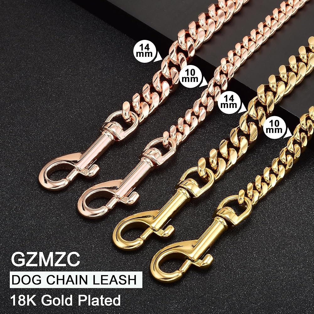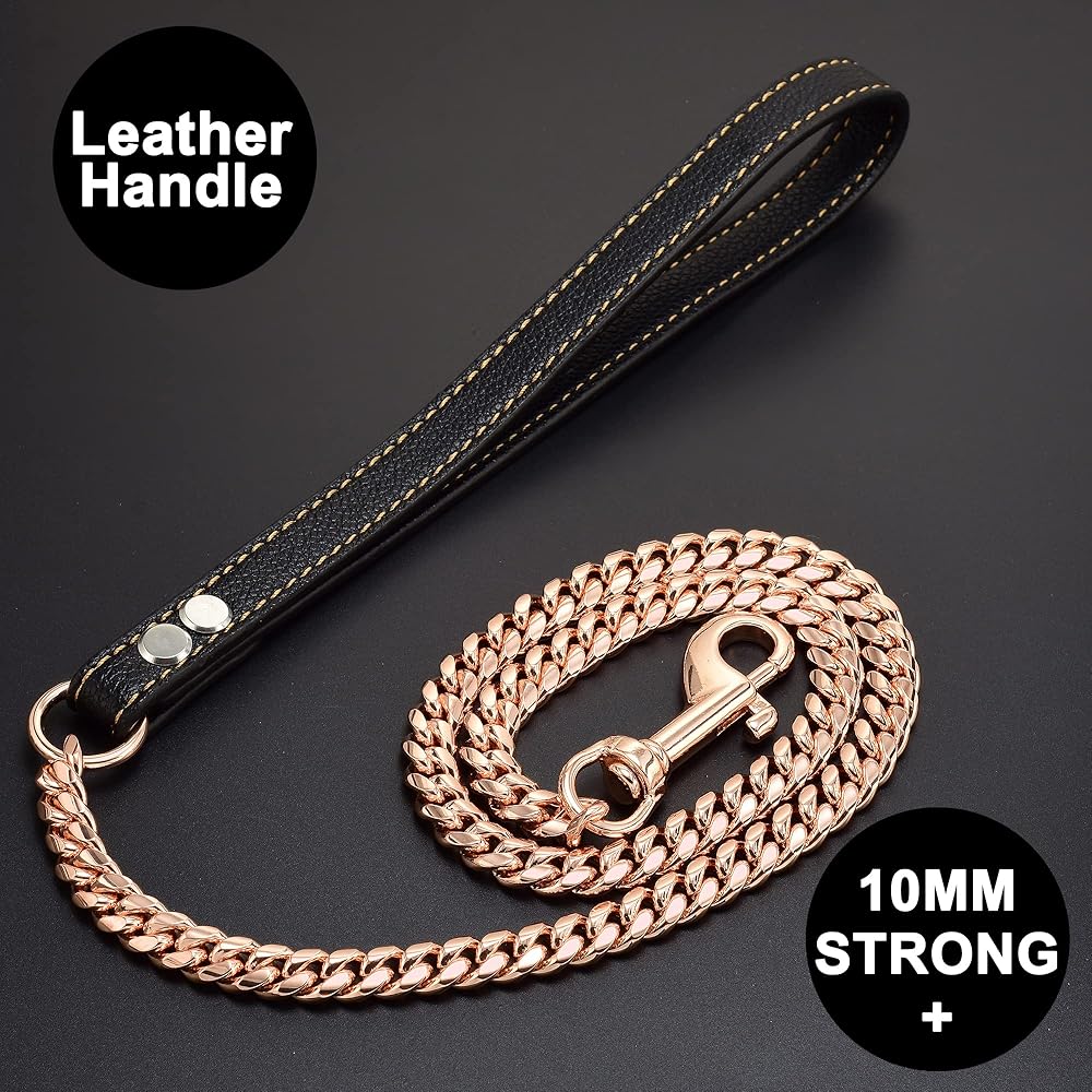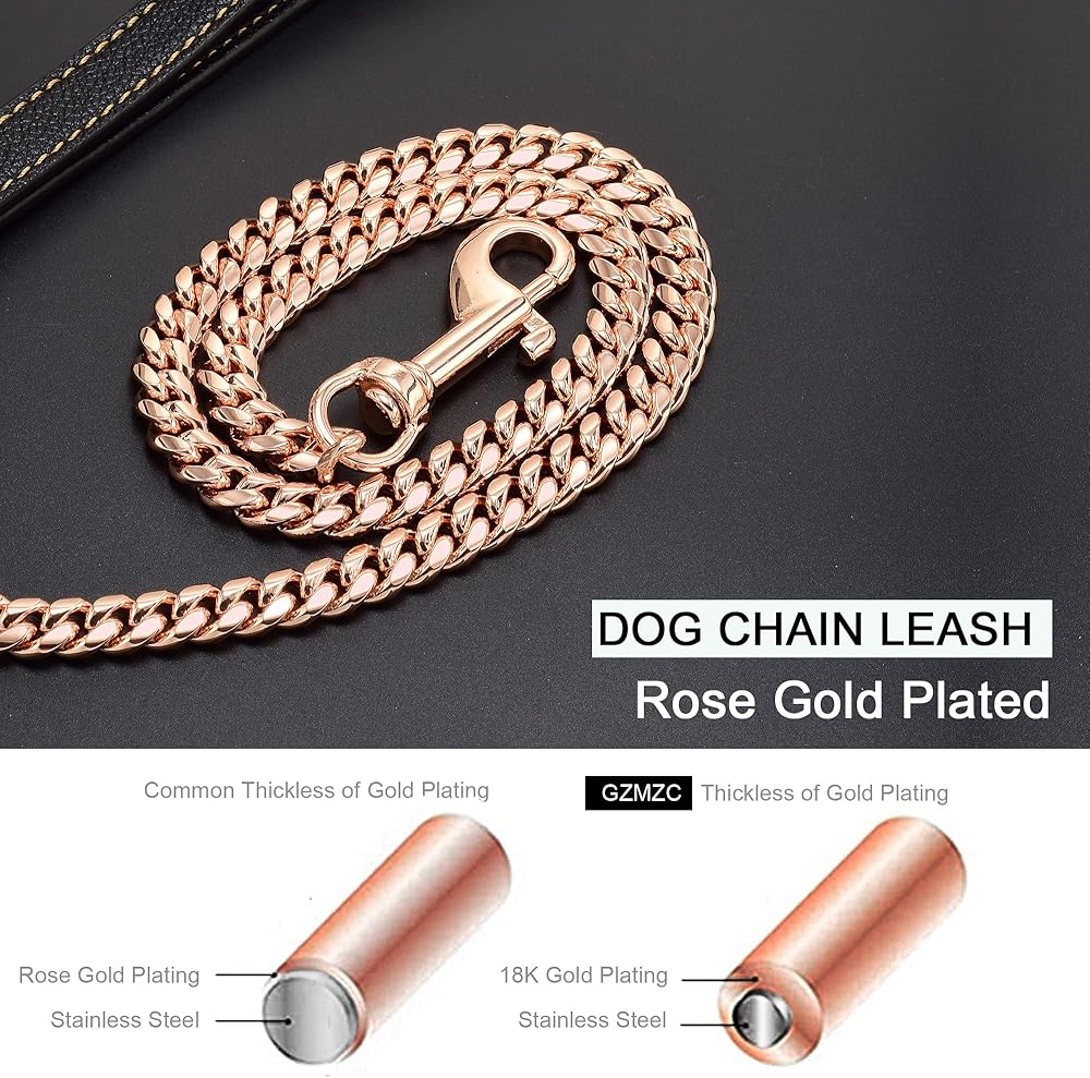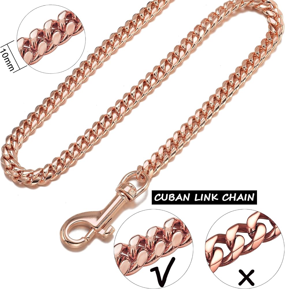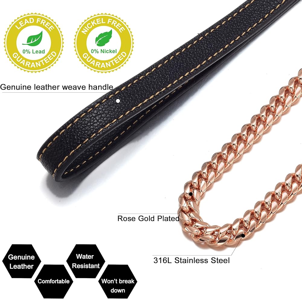 What's this Dog Leash made of?: It's Rose gold plated over 316L stainless steel Cuban link chain with genuine leather handle. Miami Cuban link Chain is high strength and hardness, heavy, durable, no rust, or tarnish, ensuring many years of use! It is easy to lock and unlock the clasp and is very strong so that it can't be pulled apart even with 700lbs of force!