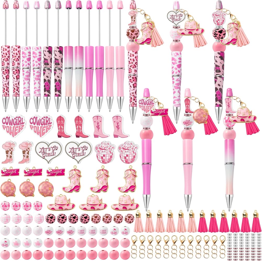 Value Set: You will receive 12pcs pink/white/brown beaded pens, 71pcs of round wooden beads, 100pcs of pink/white/champagne rhinestone crystal spacer beads, 24pcs pink/white/brown alloy buckles with tassel, 12pcs coffee and bread shape alloy ornaments and 12pcs laser foil bags. These accessories can make up to 12 pens.