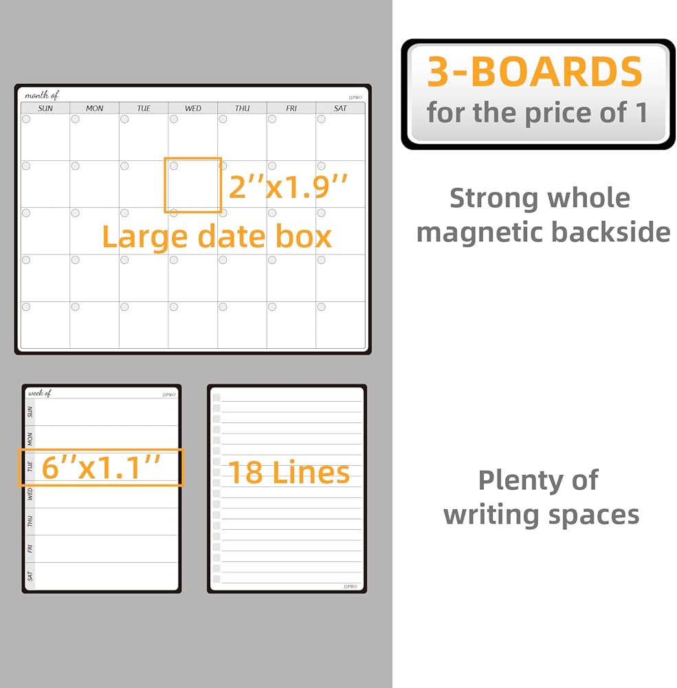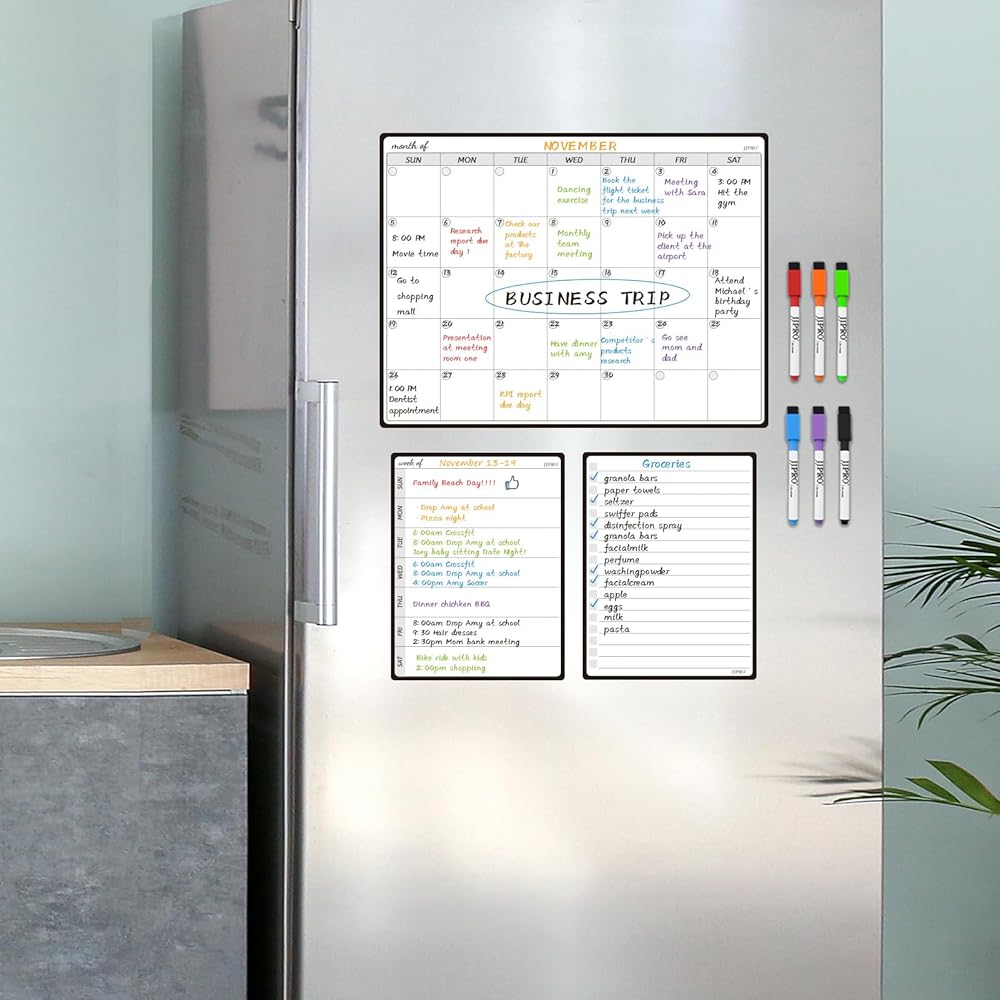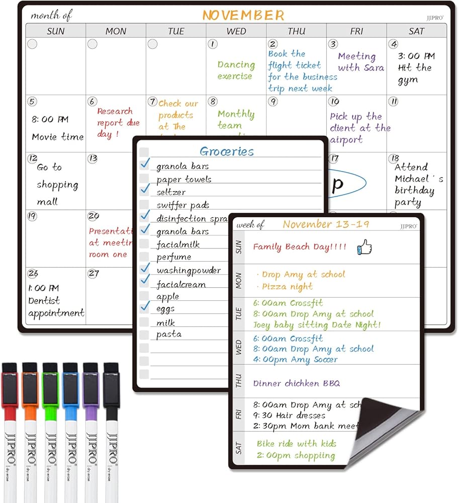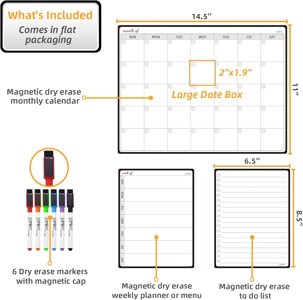 JJPRO Magnetic Monthly Calendar Whiteboard Set for Fridge-Monthly Planning Board and Two Bonus Dry Erase Grocery Board&Weekly Menu Board-Meal Planner Whiteboard/To-Do List-6 Markers