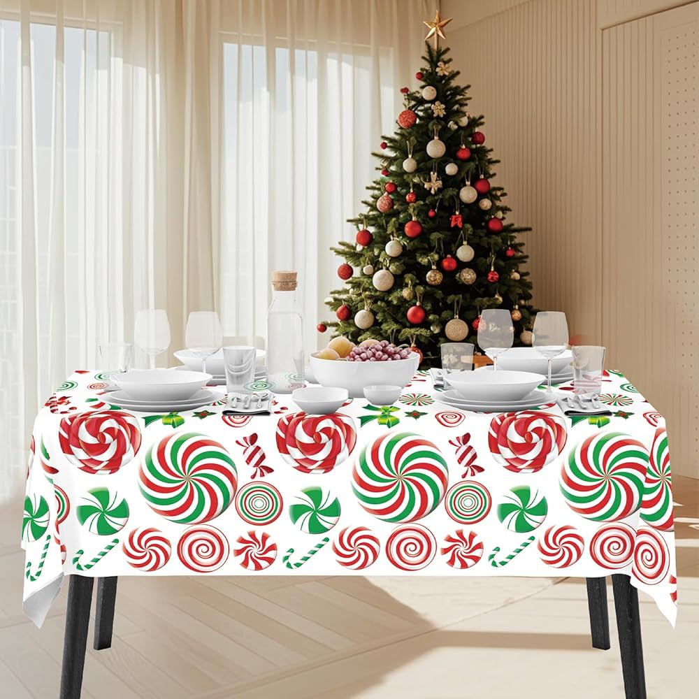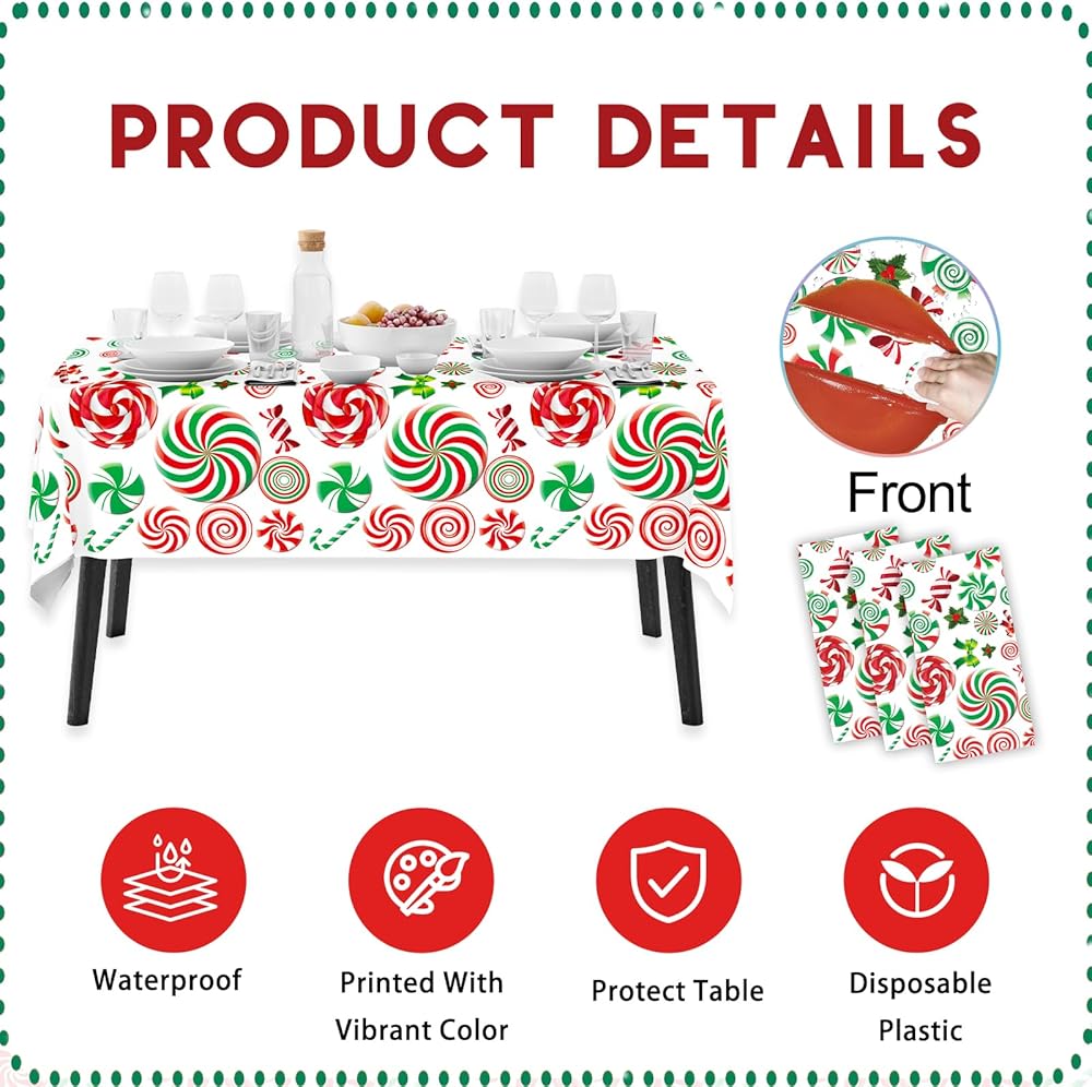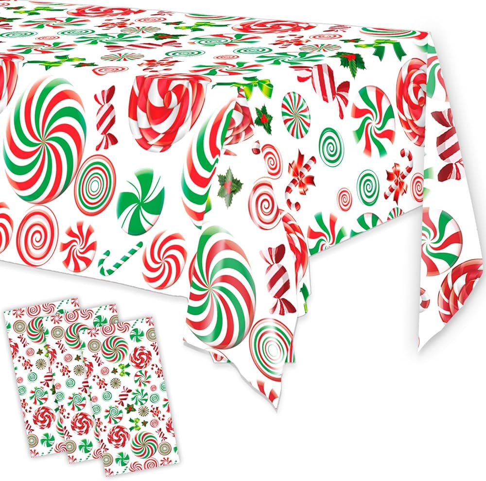 3 Pack Christmas Tablecloth Disposable, Candy Cane Table Cloth for Xmas Party Decorations, Plastic Table Cover for Rectangle Tables Supplies, 54 x 108 Inch