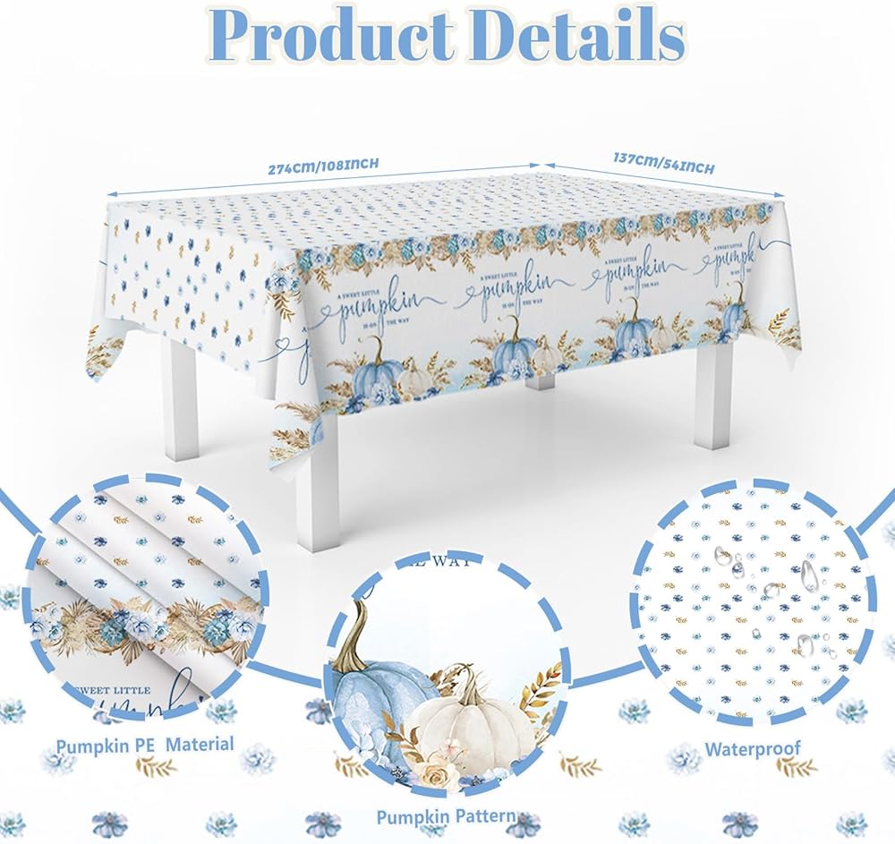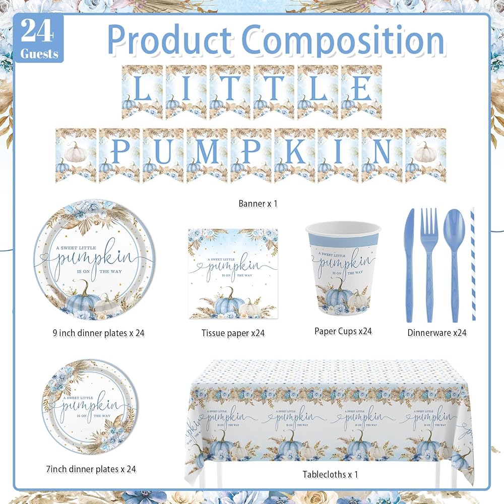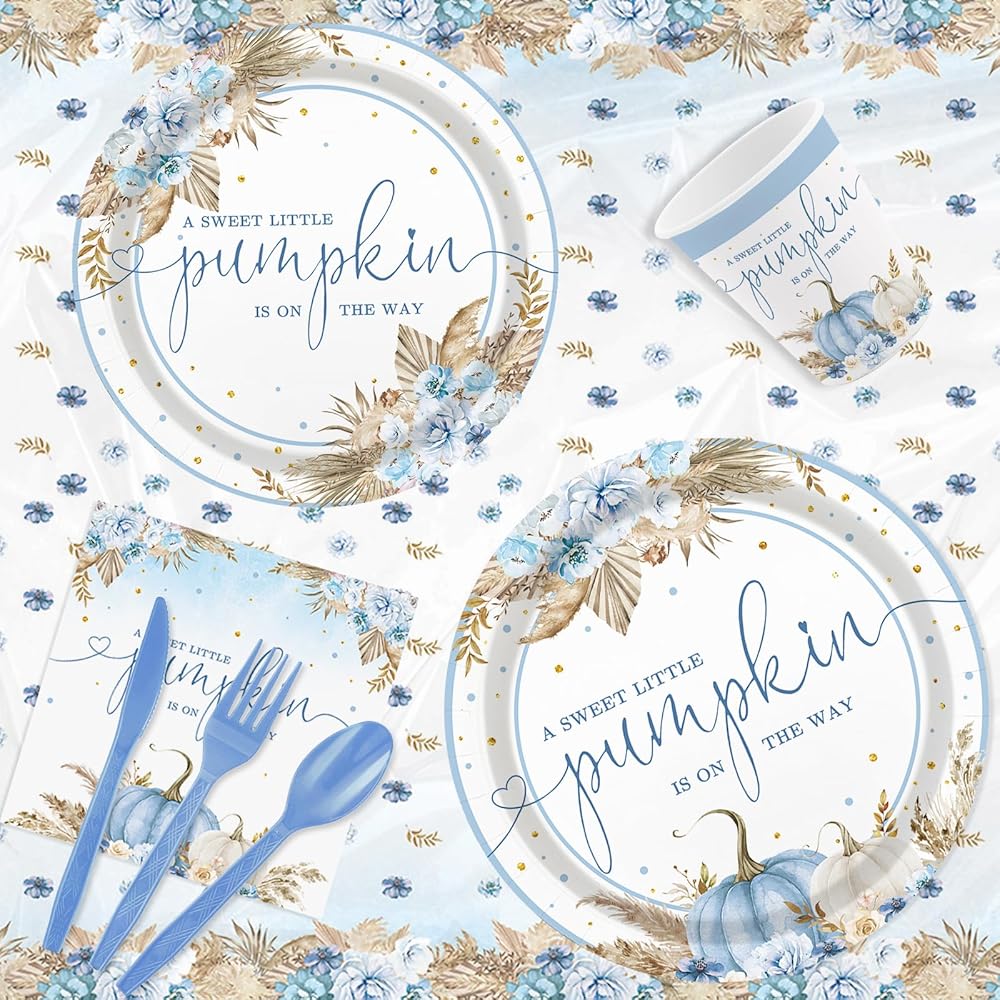 194Pcs Fall Pumpkin Baby Shower Decorations for Boys, Boho Floral Pampas Grass Little Pumpkin Party Supplies Disposable Tableware Set Plates Napkins Banners Plastic Tablecloth for Baby Shower